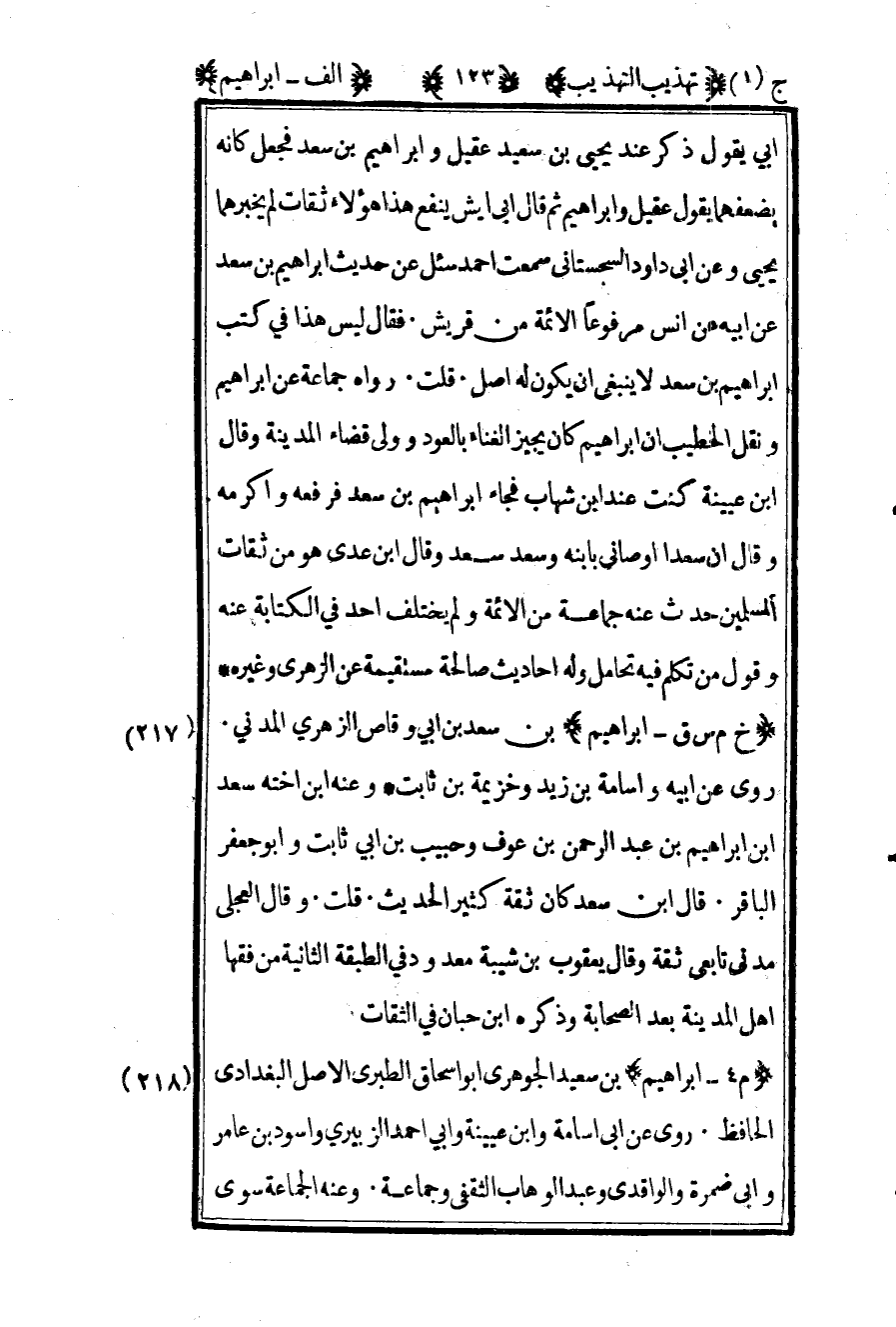 217 ـ "خ م س- إبراهيم" بن سعد بن أبي وقاص الزهري المدني. روى عن أبيه وأسامة بن زيد وخزيمة ابن ثابت, وعنه ابن أخته سعد بن إبراهيم بن عبد الرحمن بن عوف, وحبيب بن أبي ثابت وأبو جعفر الباقر. قال ابن سعد: "كان ثقة كثير الحديث". قلت: وقال العجلي: "مدني تابعي ثقة", وقال يعقوب بن شيبة: "معدود في الطبقة الثانية من فقهاء أهل المدينة بعد الصحابة". وذكره بن حبان في الثقات.