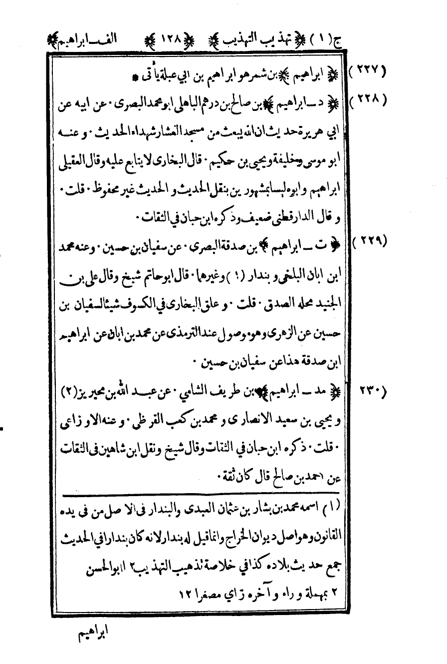 1 - اسمه محمد بن بشار بن عثمان العبدي والبندار في الأصل من في يده القانون وهو أصل ديوان الخراج إنما قيل له بندار لأنه كان بندار في الحديث جمع حديث بلاده كذا في خلاصة تهذيب التهذيب 12أبو الحسن