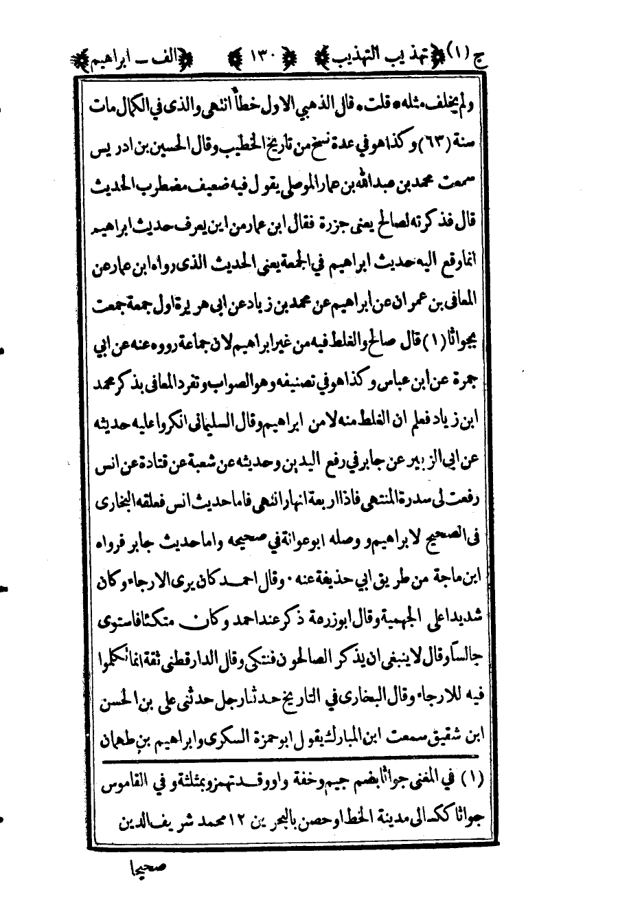 ولم يخلف مثله". قلت: قال الذهبي: "الأول خطأ", انتهى. والذي في الكمال: "مات سنة "63", وكذا هو في عدة نسخ من تاريخ الخطيب, وقال الحسين بن إدريس سمعت محمد بن عبد الله بن عمار الموصلي يقول فيه: "ضعيف مضطرب الحديث", قال فذكرته لصالح -يعني جزرة- فقال ابن عمار من أين يعرف حديث إبراهيم إنما وقع إليه حديث إبراهيم في الجمعة, يعني الحديث الذي رواه ابن عمار عن المعافى بن عمران عن إبراهيم عن محمد بن زياد عن أبي هريرة: "أول جمعة جمعت بجواثا1", قال صالح: "والغلط فيه من غير إبراهيم لأن جماعة رووه عنه عن أبي جمرة عن ابن عباس, وكذا هو في تصنيفه, وهو الصواب وتفرد المعافى بذكر محمد بن زياد فعلم أن الغلط منه لا من إبراهيم", وقال السليماني: "أنكروا عليه حديثه عن أبي الزبير عن جابر في "رفع اليدين" وحديثه عن شعبة عن قتادة عن أنس "رفعت لي سدرة المنتهى فإذا أربعة انهار" انتهى. فأما حديث أنس فعلقه البخاري في الصحيح لإبراهيم ووصله أبو عوانة في صحيحه, وأما حديث جابر فرواه ابن ماجة من طريق أبي حذيفة عنه, وقال أحمد: "كان يرى الإرجاء وكان شديدا على الجهمية", وقال أبو زرعة: "ذكر عند أحمد وكان متكئا فاستوى جالسا, وقال لا ينبغي أن يذكر الصالحون فنتكي", وقال الدارقطني: "ثقة إنما تكلموا فيه للإرجاء", وقال البخاري في التاريخ: "حدثنا رجل حدثني على بن الحسن بن شقيق, سمعت ابن المبارك يقول أبو حمزة السكري وإبراهيم بن طهمان