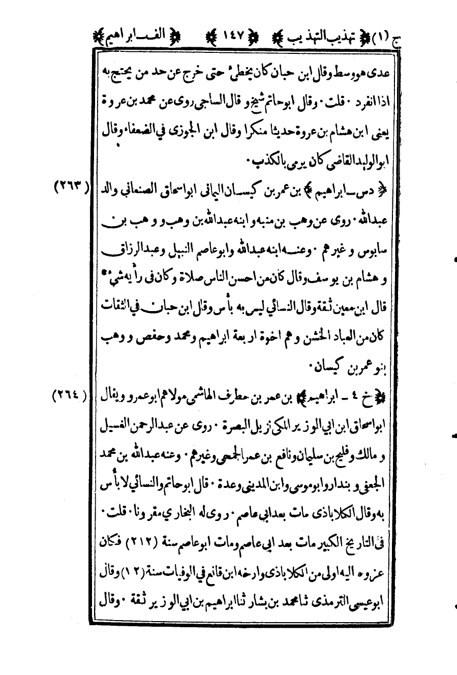 263 ـ "د س - إبراهيم" بن عمر بن كيسان اليماني أبو إسحاق الصنعاني والد عبد الله. روى عن وهب بن منبه وابنه عبد الله بن وهب ووهب بن سابوس وغيرهم. وعنه ابنه عبد الله وأبو عاصم النبيل وعبد الرزاق وهشام بن يوسف, وقال: "كان من أحسن الناس صلاة وكان في رأيه شيء", قال ابن معين: "ثقة", وقال النسائي: "ليس به بأس", وقال ابن حبان في الثقات: "كان من العباد الخشن وهم إخوة أربعة: إبراهيم ومحمد وحفص ووهب بنو عمر بن كيسان".