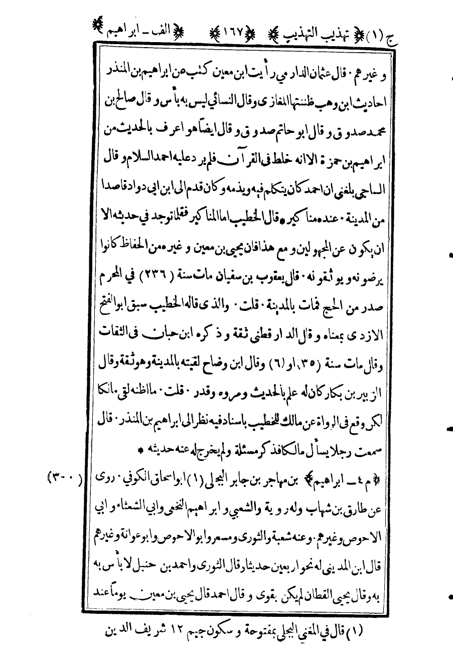 301 ـ "م 4 - إبراهيم" بن مهاجر بن جابر البجلي1 أبو إسحاق الكوفي. روى عن طارق بن شهاب وله روية والشعبي وإبراهيم النخعي وأبي الشعثاء وأبي الأحوص وغيرهم. وعنه شعبة والثوري ومسعر وأبو الأحوص وأبو عوانة وغيرهم قال ابن المديني: "له نحو أربعين حديثا" وقال الثوري وأحمد بن حنبل: "لا بأس به" وقال يحيى القطان: "لم يكن بقوي", وقال أحمد قال يحيى بن معين يوما عند
