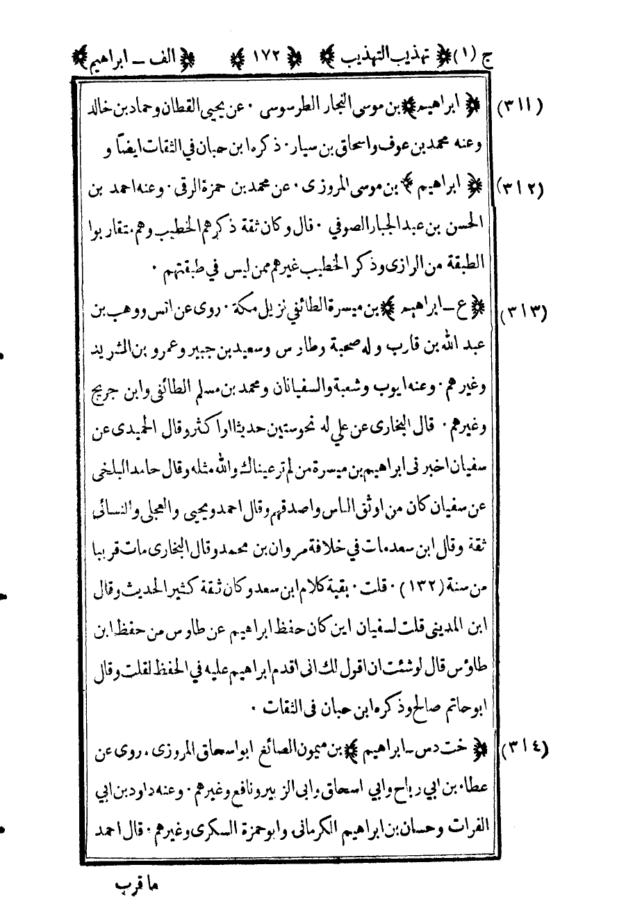 313 ـ "ع - إبراهيم" بن ميسرة الطائفي نزيل مكة. روى عن أنس ووهب بن عبد الله بن قارب وله صحبة وطاوس وسعيد بن جبير وعمرو بن الشريد وغيرهم. وعنه أيوب وشعبة والسفيانان ومحمد بن مسلم الطائفي وابن جريج وغيرهم. قال البخاري عن علي: له نحو ستين حديثا وأكثر وقال الحميدي عن سفيان: أخبرني إبراهيم بن ميسرة من لم تر عيناك والله مثله, وقال حامد البلخي عن سفيان: "كان من أوثق الناس وأصدقهم", وقال أحمد ويحيى والعجلي والنسائي: "ثقة" وقال ابن سعد: مات في خلافة مروان بن محمد وقال البخاري: مات قريبا من سنة "132". قلت: بقية كلام ابن سعد: "وكان ثقة كثير الحديث" وقال ابن المديني قلت لسفيان أين كان حفظ إبراهيم بن طاوس من حفظ ابن طاوس قال لو شئت أن أقول لك إني أقدم إبراهيم عليه في الحفظ لقلت, وقال أبو حاتم "صالح" وذكره ابن حبان في الثقات.
