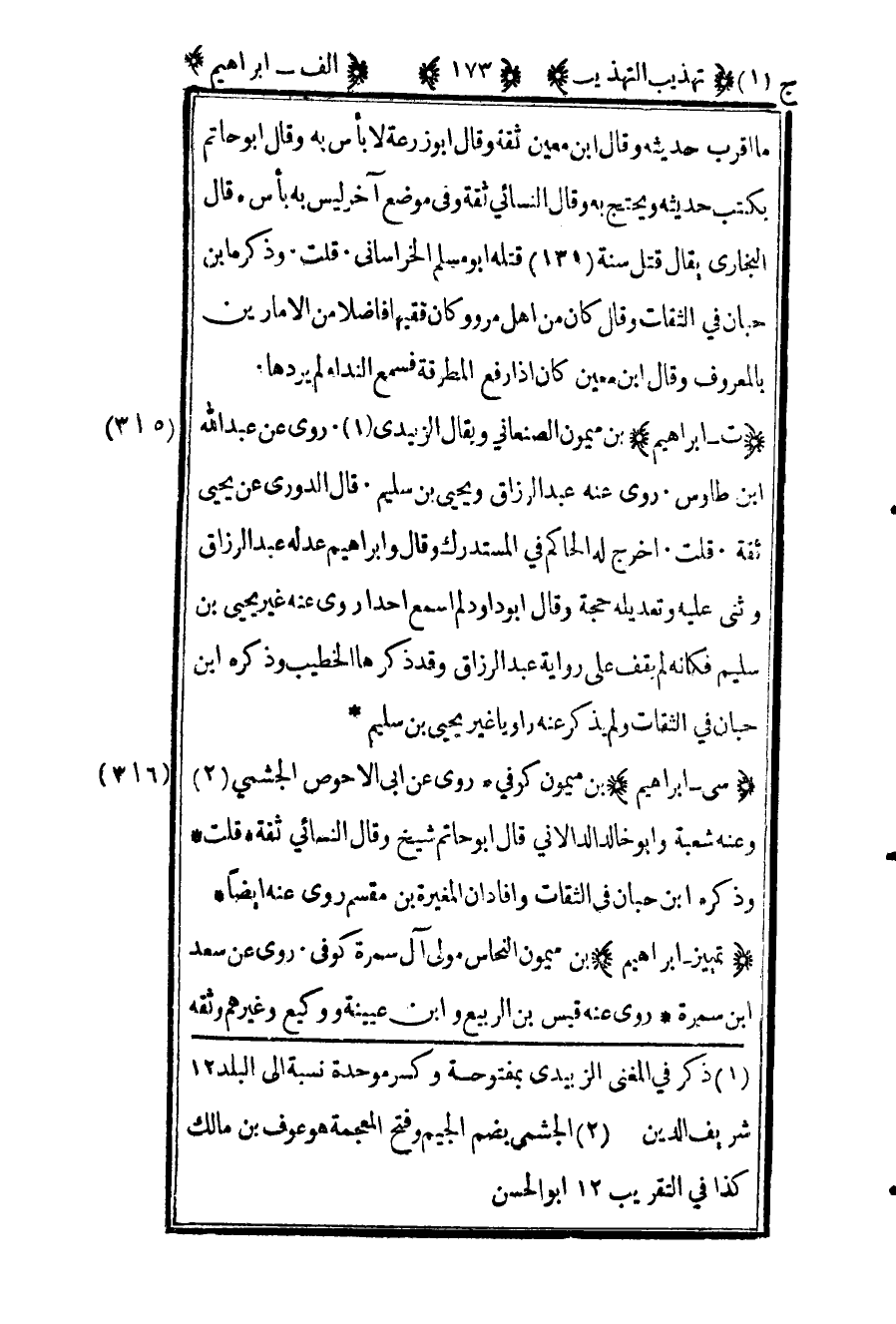 315 ـ "ت - إبراهيم" بن ميمون الصنعاني ويقال الزبيدي1. روى عن عبد الله بن طاوس. روى عنه عبد الرزاق ويحيى بن سليم. قال الدوري عن يحيى: "ثقة". قلت: أخرج له الحاكم في المستدرك وقال وإبراهيم عدله عبد الرزاق وأثنى عليه وتعديله حجة, وقال أبو داود لم أسمع أحدا روى عنه غير يحيى بن سليم فكأنه لم يقف على رواية عبد الرزاق, وقد ذكرها الخطيب وذكره ابن حبان في الثقات ولم يذكر عنه راويا غير يحيى بن سليم.
