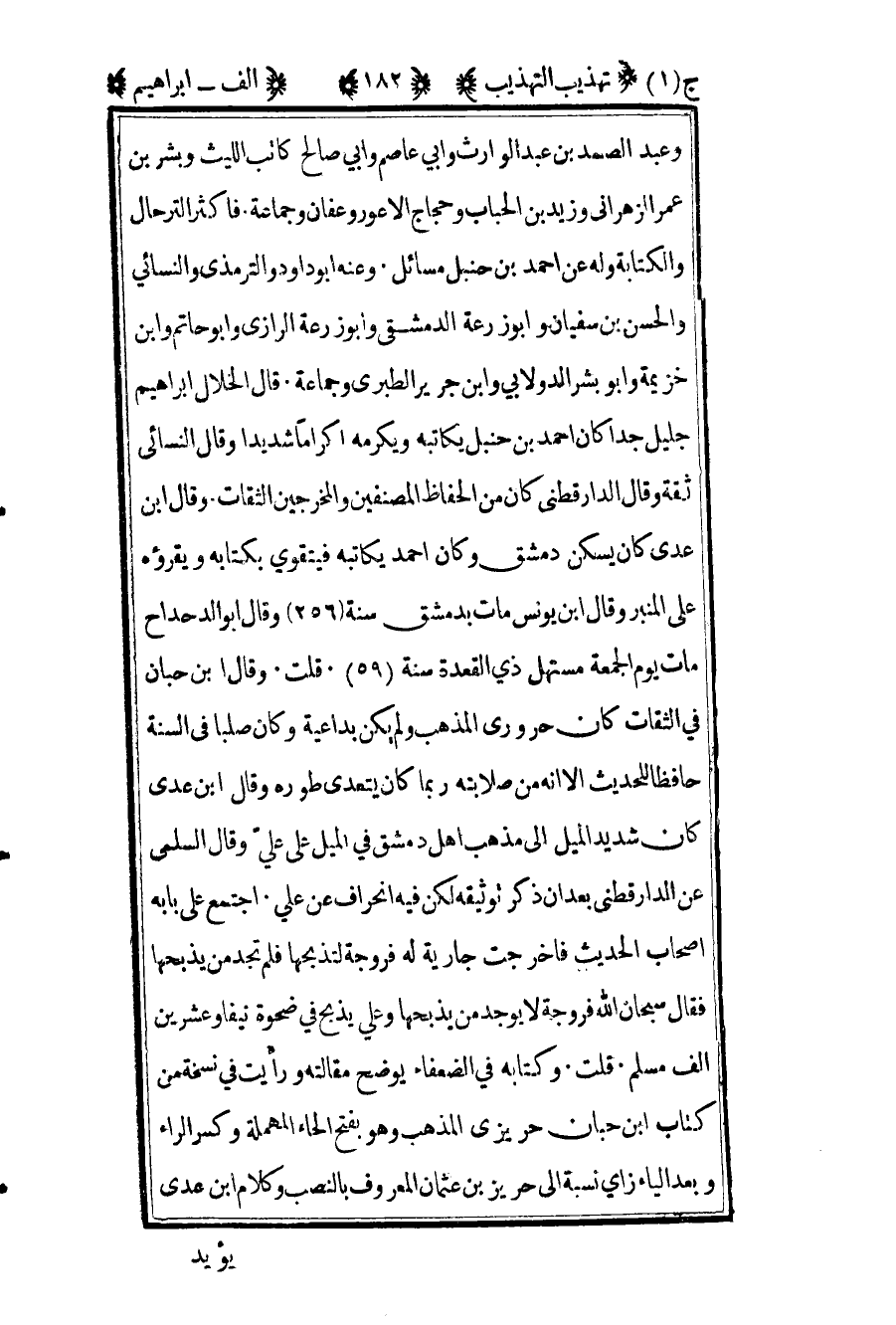وعبد الصمد بن عبد الوارث وأبي عاصم وأبي صالح كاتب الليث وبشر بن عمر الزهراني وزيد بن الحباب وحجاج الأعور وعفان وجماعة. فأكثر الترحال والكتابة وله عن أحمد بن حنبل مسائل وعنه أبو داود والترمذي والنسائي والحسن بن سفيان وأبو زرعة الدمشقي وأبو زرعة الرازي وأبو حاتم وابن خزيمة وأبو بشر الدولابي وابن جرير الطبري وجماعة. قال الخلال: "إبراهيم جليل جدا كان أحمد بن حنبل يكاتبه ويكرمه إكراما شديدا" وقال النسائي: "ثقة" وقال الدارقطني: "كان من الحفاظ المصنفين والمخرجين الثقات" وقال ابن عدي: "كان يسكن دمشق وكان أحمد يكاتبه فيتقوى بكتابه ويقرؤه على المنبر", وقال ابن يونس مات بدمشق سنة "256" وقال أبو الدحداح مات يوم الجمعة مستهل ذي القعدة سنة "59". قلت وقال ابن حبان في الثقات: "كان حروري المذهب ولم يكن بداعية وكان صلبا في السنة حافظا للحديث إلا أنه من صلابته ربما كان يتعدى طوره", وقال ابن عدي: "كان شديد الميل إلى مذهب أهل دمشق في الميل على علي" وقال السلمي عن الدارقطني بعد أن ذكر توثيقه: "لكن فيه انحراف عن علي". اجتمع على بابه أصحاب الحديث فأخرجت جارية له فروجة لتذبحها فلم تجد من يذبحها فقال سبحان الله فروجة لا يوجد من يذبحها وعلي يذبح في ضحوة نيفا وعشرين ألف مسلم. قلت: وكتابه في الضعفاء يوضح مقالته ورأيت في نسخة من كتاب ابن حبان حريزي المذهب -وهو بفتح الحاء المهملة وكسر الراء وبعد الياء زاي- نسبة إلى حريز بن عثمان المعروف بالنصب وكلام ابن عدي