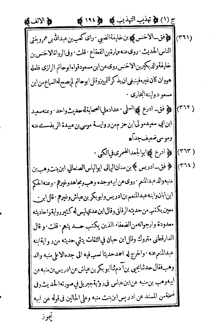 364 ـ "فق - إدريس" بن سنان اليماني أبو إلياس الصنعاني بن بنت وهب بن منبه والد عبد المنعم. روى عن أبيه وجده وهب ومجاهد وغيرهم. وعنه الحكم بن أبان وابنه عبد المنعم بن إدريس وأبو بكر بن عياش وغيرهم. قال ابن معين: "يكتب من حديثه الرقاق" وقال ابن عدي: "ليس له كثير رواية وأحاديثه معدودة وأرجو أنه من الضعفاء الذين يكتب حديثهم". قلت: وقال الدارقطني "متروك" وقال ابن حبان في الثقات: "يتقي حديثه من رواية ابنه عبد المنعم عنه" وأخرج له أحمد حديثا نسب فيه إلى جده الأعلى منبه والد وهب فقال حدثنا يحيى بن آدم ثنا أبو بكر بن عياش عن إدريس بن منبه عن أبيه وهب بن منبه عن ابن عباس "في رؤية جبريل في صورته" الحديث. وفي نسخة من المسند عن إدريس بن بنت منبه وعلى الحالين في قوله عن أبيه