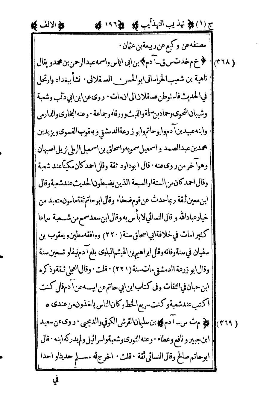 368 ـ "خ م خد ت س ق - آدم" بن أبي إياس واسمه عبد الرحمن بن محمد ويقال ناهية بن شعيب الخراساني أبو الحسن العسقلاني. نشأ ببغداد وارتحل في الحديث فاستوطن عسقلان إلى أن مات. روى عن ابن أبي ذئب وشعبة وشيبان النحوي وحماد بن سلمة والليث وورقاء وجماعة. وعنه البخاري والدارمي وابنه عبيد بن آدم وأبو حاتم وأبو زرعة الدمشقي ويعقوب الفسوي ويزيد بن محمد بن عبد الصمد وإسماعيل سمويه وإسحاق بن إسماعيل الرملي نزيل أصبهان وهو آخر من روى عنه. قال أبو داود "ثقة" وقال أحمد "كان مكينا عند شعبة" وقال أحمد "كان من الستة أو السبعة الذين يضبطون الحديث عند شعبة" وقال ابن معين "ثقة ربما حدث عن قوم ضعفاء" وقال أبو حاتم "ثقة مأمون متعبد من خيار عباد الله" وقال النسائي: "لا بأس به" وقال ابن سعد "سمع من شعبة سماعا كثيرا مات في خلافة أبي إسحاق سنة "22"" ووافقه مطين ويعقوب بن سفيان في سنة وفاته وقال إبراهيم بن الهيثم البلوي "بلغ آدم نيفا وتسعين سنة" وقال أبو زرعة الدمشقي مات سنة "221". قلت: وقال العجلي "ثقة" وذكره ابن حبان في الثقات وفي كتاب ابن أبي حاتم عن أبيه عن آدم قال كنت اكتب عند شعبة وكنت سريع الخط وكان الناس يأخذون من عندي.