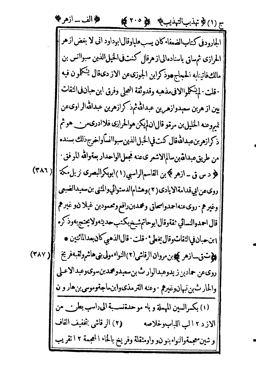 386 ـ "د س ق - أزهر" بن القاسم الراسبي1 أبو بكر البصري نزيل مكة روى عن أبي قدامة الأيادي وهشام الدستوائي والمثنى بن سعيد الضبعي وغيرهم. روى عنه أحمد وإسحاق ومحمد بن رافع ومحمود بن غيلان وغيرهم. قال أحمد والنسائي: "ثقة" وقال أبو حاتم: "شيخ يكتب حديثه ولا يحتج به" وذكره ابن حبان في الثقات وقال: "يخطئ". قلت: "قال الذهبي: كان بعد المائتين".