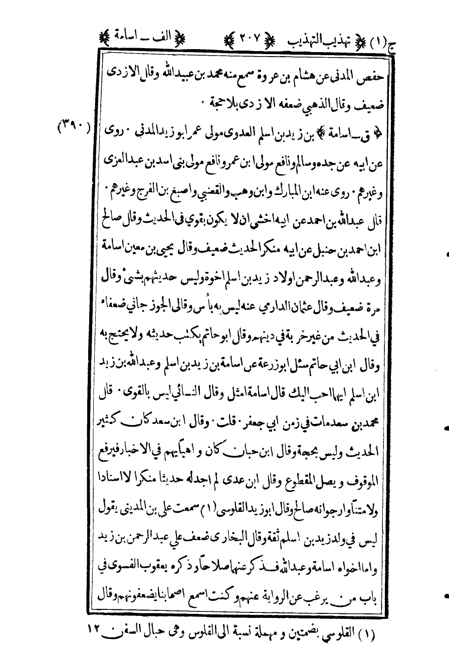 390 ـ "ق - أسامة" بن زيد بن أسلم العدوي مولى عمر أبو زيد المدني. روى عن أبيه عن جده وسالم ونافع مولى بن عمر ونافع مولى بني أسد بن عبد العزى وغيرهم. روى عنه بن المبارك وابن وهب والقعنبي واصبغ بن الفرج وغيرهم. قال عبد الله بن أحمد عن أبيه "أخشى أن لا يكون بقوي في الحديث" وقال صالح ابن أحمد بن حنبل عن أبيه: "منكر الحديث ضعيف" وقال يحيى بن معين: "أسامة وعبد الله وعبد الرحمن أولاد زيد بن أسلم إخوة وليس حديثهم بشيء" وقال مرة: "ضعيف" وقال عثمان الدارمي عنه: "ليس به بأس" وقال الجوزجاني: "ضعفاء في الحديث من غير خربة في دينهم" وقال أبو حاتم: "يكتب حديثه ولا يحتج به" وقال ابن أبي حاتم سئل أبو زرعة عن أسامة بن زيد بن أسلم وعبد الله بن زيد بن أسلم أيهما أحب إليك قال: "أسامة أمثل" وقال النسائي: "ليس بالقوي". قال محمد بن سعد: "مات في زمن أبي جعفر". قلت: وقال ابن سعد "كان كثير الحديث وليس بحجة" وقال ابن حبان: "كان واهيا يهم في الأخبار فيرفع الموقوف ويصل المقطوع" وقال ابن عدي: "لم أجد له حديثا منكرا لا إسنادا ولا متنا وأرجو أنه صالح" وقال أبو زيد القلوسي1 سمعت علي بن المديني يقول: "ليس في ولد زيد بن أسلم ثقة" وقال البخاري: "ضعف علي عبد الرحمن بن زيد وأما أخواه أسامة وعبد الله فذكر عنهما صلاحا" وذكره يعقوب الفسوي في باب من يرغب عن الرواية عنهم وكنت أسمع أصحابنا يضعفونهم وقال
