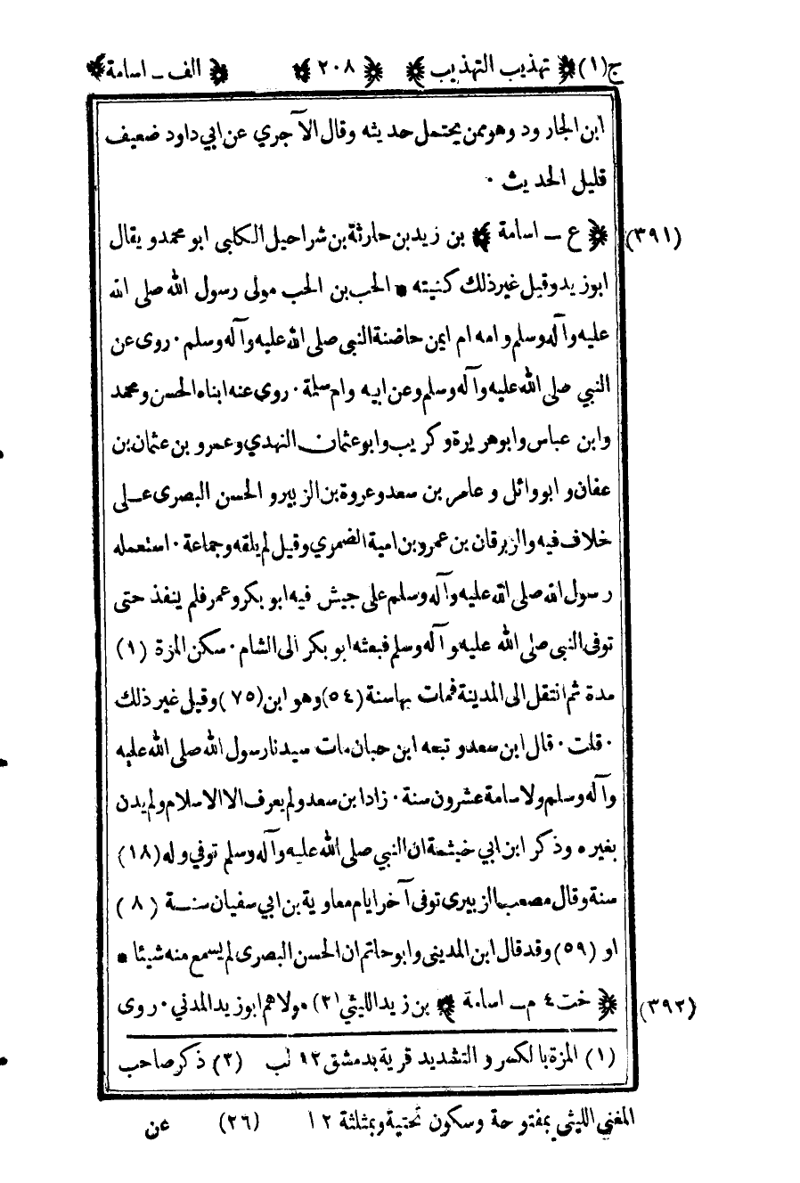391 ـ "ع - أسامة" بن زيد بن حارثة بن شراحيل الكلبي أبو محمد ويقال أبو زيد وقيل غير ذلك كنيته الحب بن الحب مولى رسول لله صلى الله عليه وآله وسلم وأمه أم أيمن حاضنة النبي صلى الله عليه وآله وسلم. روى عن النبي صلى الله عليه وآله وسلم وعن أبيه وأم سلمة. روى عنه ابناه الحسن ومحمد وابن عباس وأبو هريرة وكريب وأبو عثمان النهدي وعمرو بن عثمان بن عفان وأبو وائل وعامر بن سعد وعروة ابن الزبير والحسن البصري على خلاف فيه والزبرقان بن عمرو بن أمية الضمري وقيل لم يلقه وجماعة. استعمله رسول الله صلى الله عليه وآله وسلم على جيش فيه أبو بكر وعمر فلم ينفذ حتى توفي النبي صلى الله عليه وآله وسلم فبعثه أبو بكر إلى الشام. سكن المزة1 مدة ثم انتقل إلى المدينة فمات بها سنة "54" وهو ابن "75" وقيل غير ذلك. قلت: قال ابن سعد وتبعه ابن حبان مات سيدنا رسول الله صلى الله عليه وآله وسلم ولأسامة عشرون سنة. زاد ابن سعد ولم يعرف إلا الإسلام ولم يدن بغيره وذكر ابن أبي خيثمة أن النبي صلى الله عليه وآله وسلم توفي وله "18" سنة وقال مصعب الزبيري توفي آخر أيام معاوية بن أبي سفيان سنة "8" أو "59" وقد قال ابن المديني وأبو حاتم أن الحسن البصري لم يسمع منه شيئا.