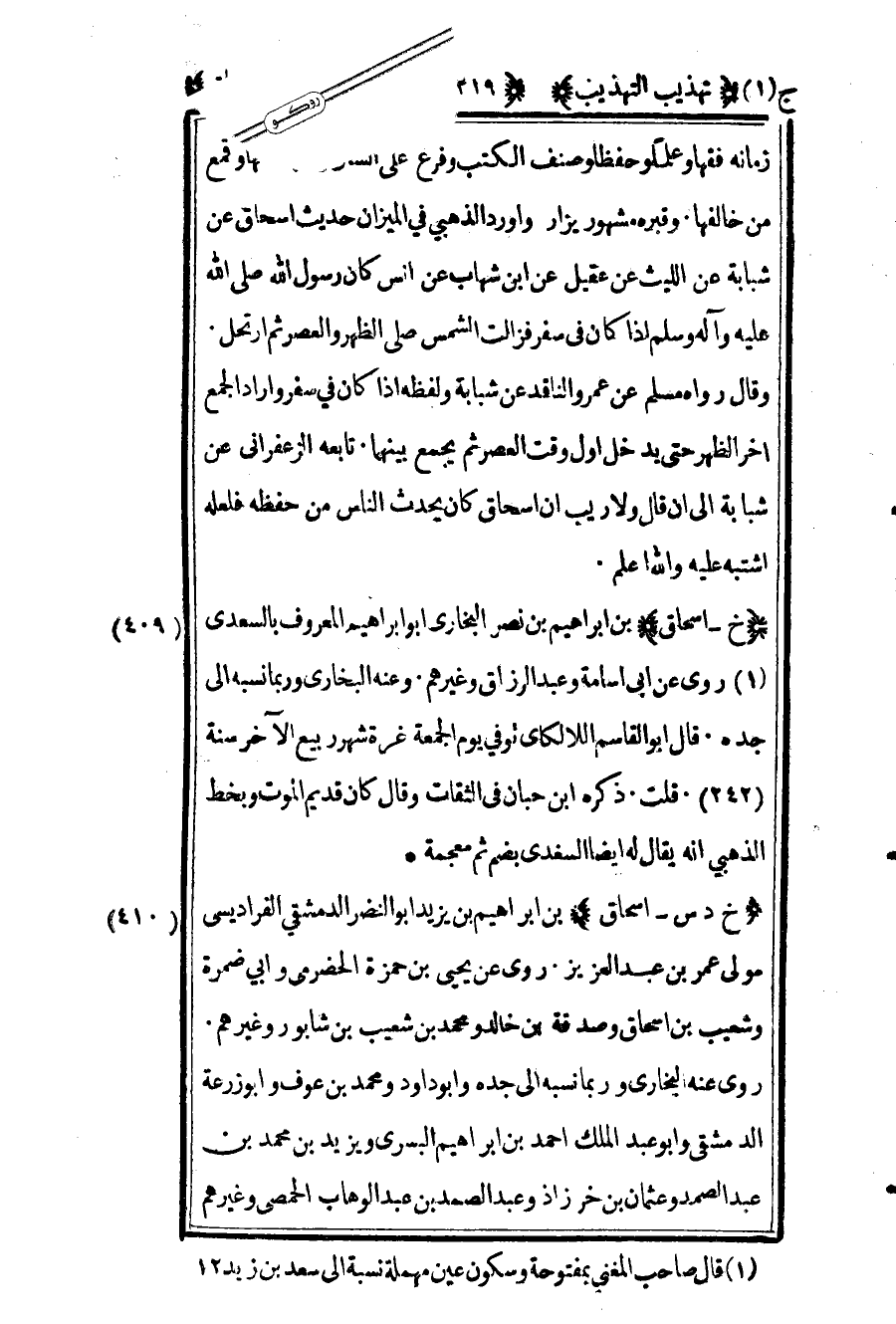 409 ـ "خ - إسحاق" بن إبراهيم بن نصر البخاري أبو إبراهيم المعروف بالسعدي1 روى عن أبي أسامة وعبد الرزاق وغيرهم. وعنه البخاري وربما نسبه إلى جده. قال أبو القاسم اللالكائي توفي يوم الجمعة غرة شهر ربيع الآخر سنة "242". قلت: ذكره ابن حبان في الثقات وقال: "كان قديم الموت" وبخط الذهبي أنه يقال له أيضا السغدي بضم ثم معجمة.
