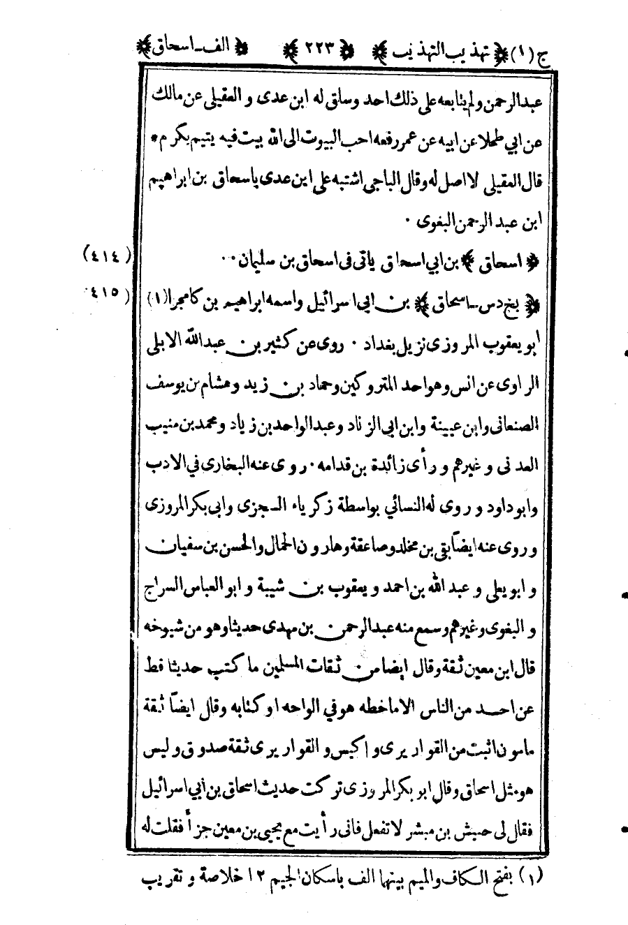 415 ـ "بخ د س - إسحاق" بن أبي إسرائيل واسمه إبراهيم بن كامجرا1 أبو يعقوب المروزي نزيل بغداد. روى عن كثير بن عبد الله الأبلي الراوي عن أنس وهو أحد المتروكين وحماد بن زيد وهشام بن يوسف الصنعاني وابن عيينة وابن أبي الزناد وعبد الواحد بن زياد ومحمد بن منيب العدني وغيرهم. ورأى زائدة بن قدامة. روى عنه البخاري في الأدب وأبو داود وروى له النسائي بواسطة زكريا السجزي وأبي بكر المروزي وروى عنه أيضا بقي بن مخلد وصاعقة وهارون الحمال والحسن بن سفيان وأبو يعلى وعبد الله بن أحمد ويعقوب بن شيبة وأبو العباس السراج والبغوي وغيرهم. وسمع منه عبد الرحمن بن مهدي حديثا وهو من شيوخه قال ابن معين: "ثقة" وقال أيضا: "من ثقات المسلمين ما كتب حديثا قط عن أحد من الناس إلا ما خطه هو في ألواحه أو كتابه" وقال أيضا: "ثقة مأمون أثبت من القواريري وأكيس" والقواريري: "ثقة صدوق" وليس هو مثل إسحاق وقال أبو بكر المروزي تركت حديث إسحاق بن أبي إسرائيل فقال لي حبيش بن مبشر لا تفعل فإني رأيت مع يحيى بن معين جزأ فقلت له