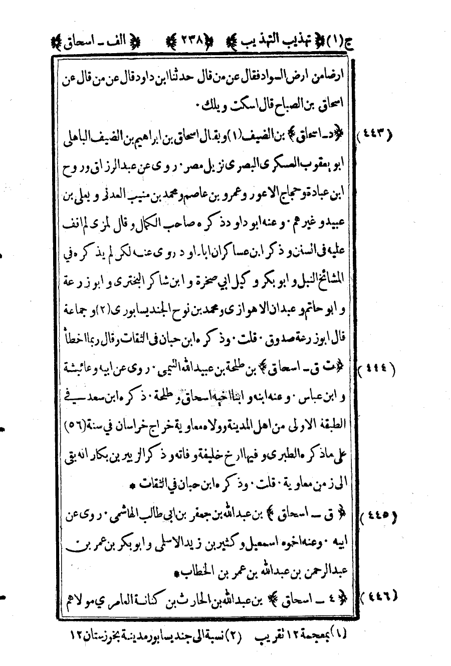 445 ـ "ق - إسحاق" بن عبد الله بن جعفر بن أبي طالب الهاشمي. روى عن أبيه وعنه أخوه إسماعيل وكثير بن زيد الأسلمي وأبو بكر بن عمر بن عبد الرحمن بن عبد الله بن عمر بن الخطاب.