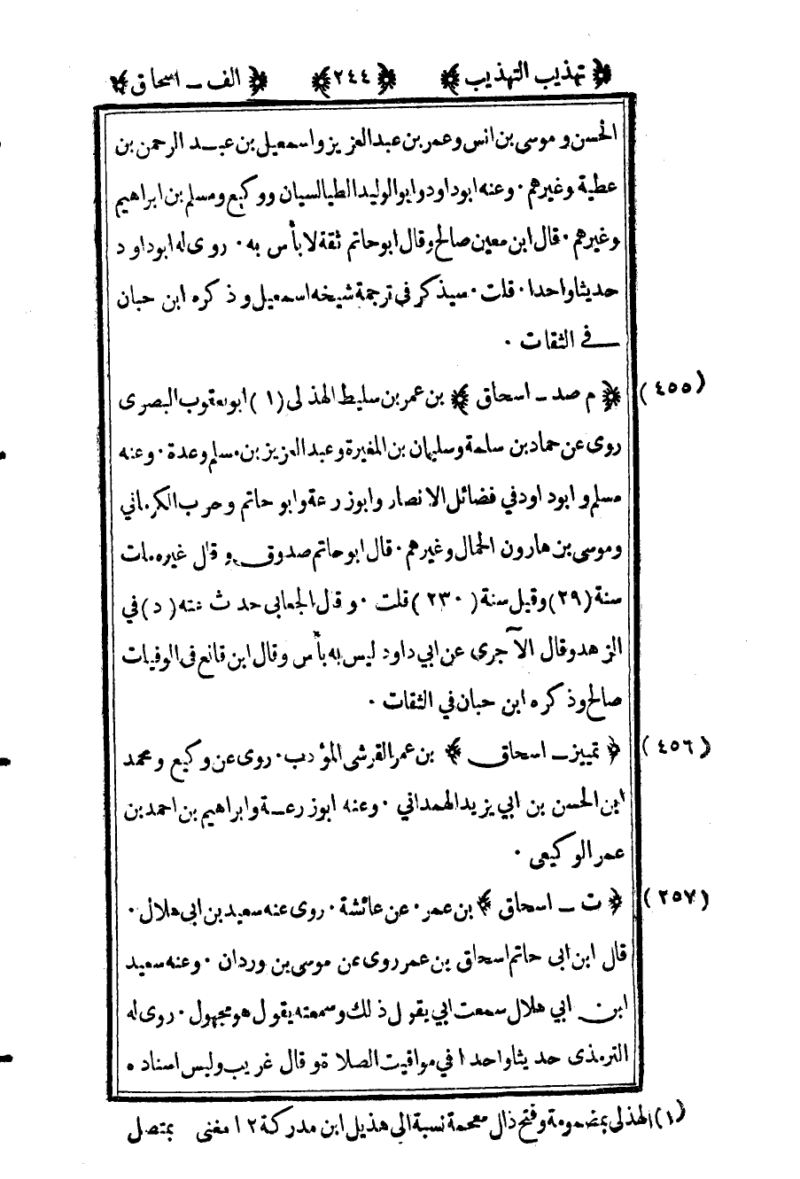 455 _ "م صد - إسحاق" بن عمر بن سليط الهذلي1 أبو يعقوب البصري. روى عن حماد بن سلمة وسليمان بن المغيرة وعبد العزيز بن مسلم وعدة. وعنه مسلم وأبو داود في فضائل الأنصار وأبو زرعة وأبو حاتم وحرب الكرماني وموسى بن هارون الحمال وغيرهم. قال أبو حاتم: "صدوق" وقال غيره: "مات سنة "29" وقيل سنة "23". قلت: وقال الجعابي حدث عنه "د" في الزهد وقال الآجري عن أبي داود: "ليس به بأس" وقال ابن قانع في الوفيات: "صالح" وذكره ابن حبان في الثقات.