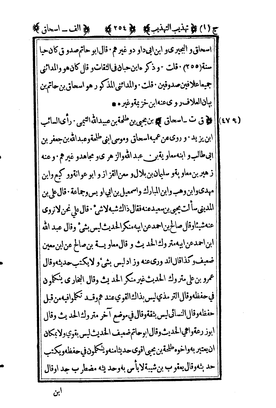 479 ـ "ق ت - إسحاق" بن يحيى بن طلحة بن عبيد الله التيمي. رأى السائب بن يزيد. وروى عن عميه إسحاق وموسى ابني طلحة وعبد الله بن جعفر بن أبي طالب وابنه معاوية بن عبد الله والزهري ومجاهد وغيرهم. وعنه زهير بن معاوية وسليمان بن بلال ومعن القزاز وأبو عوانة ووكيع وابن مهدي وابن وهب وابن المبارك وإسماعيل بن أبي أويس وجماعة. قال علي بن المديني: سألت يحيى بن سعيد عنه فقال: "ذاك شبه لا شيء". قال علي: "نحن لا نروي عنه شيئا" وقال صالح بن أحمد عن أبيه: "منكر الحديث ليس بشيء" وقال عبد الله بن أحمد عن أبيه:" متروك الحديث" وقال معاوية بن صالح عن ابن معين: "ضعيف" وكذا قال الدوري عنه وزاد: "ليس بشيء ولا يكتب حديثه" وقال عمرو بن علي: "متروك الحديث غير منكر الحديث" وقال البخاري: "يتكلمون في حفظه" وقال الترمذي: "ليس بذاك القوي عندهم وقد تكلموا فيه من قبل حفظه" وقال النسائي: "ليس بثقة" وقال في موضع آخر: "متروك الحديث" وقال أبو زرعة: "واهي الحديث" وقال أبو حاتم: "ضعيف الحديث ليس بقوي ولا بمكان أن يعتبر به وأخوه طلحة بن يحيى أقوى حديثا منه ويتكلمون في حفظه ويكتب حديثه" وقال يعقوب بن شيبة: لا بأس به وحديثه مضطرب جدا" وقال