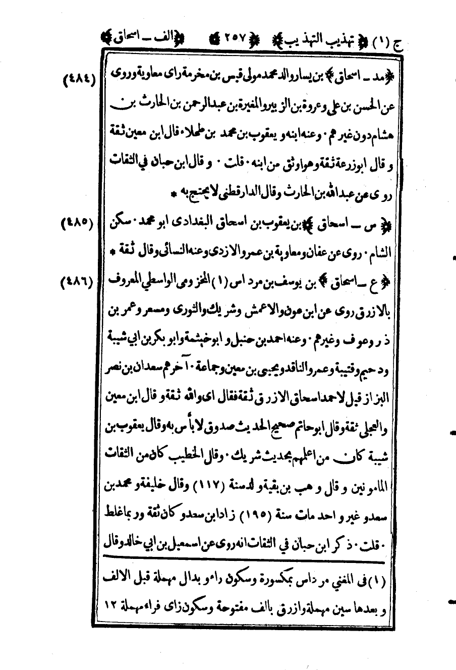 485 ـ "س - إسحاق" بن يعقوب بن إسحاق البغدادي أبو محمد سكن الشام. روى عن عفان ومعاوية بن عمرو الأزدي وعنه النسائي وقال: "ثقة".