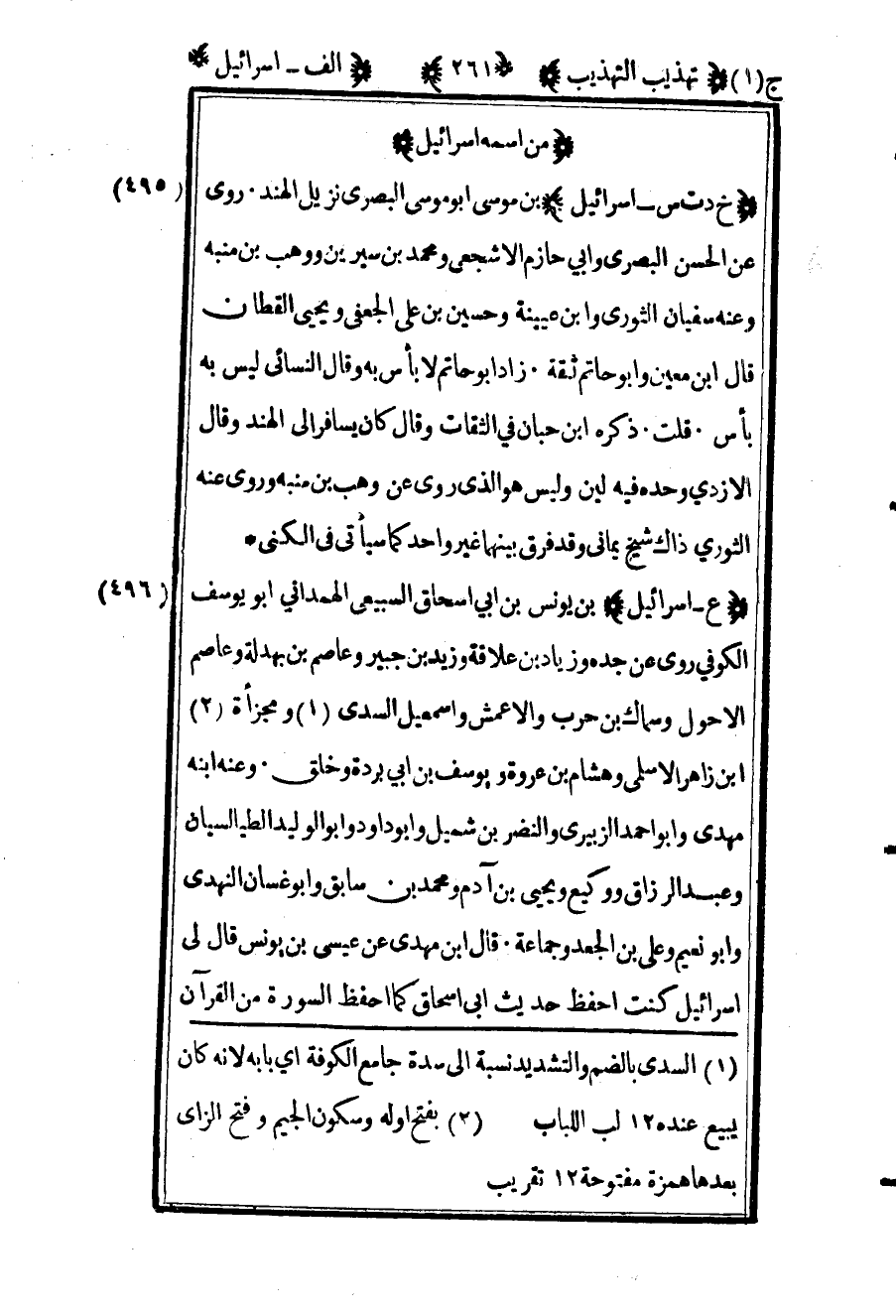 496 ـ "ع - إسرائيل" بن يونس بن أبي إسحاق السبيعي الهمداني أبو يوسف الكوفي. روى عن جده وزياد بن علاقة وزيد بن جبير وعاصم بن بهدلة وعاصم الأحول وسماك بن حرب والأعمش وإسماعيل السدي1 ومجزأة2 بن زاهر الأسلمي وهشام بن عروة ويوسف بن أبي بردة وخلق. وعنه ابنه مهدي وأبو أحمد الزبيري والنضر بن شميل وأبو داود وأبو الوليد الطيالسي وعبد الرزاق ووكيع ويحيى بن آدم ومحمد بن سابق وأبو غسان النهدي وأبو نعيم وعلى بن الجعد وجماعة. قال ابن مهدي عن عيسى بن يونس: "قال لي إسرائيل كنت أحفظ حديث أبي إسحاق كما أحفظ السورة من القرآن"