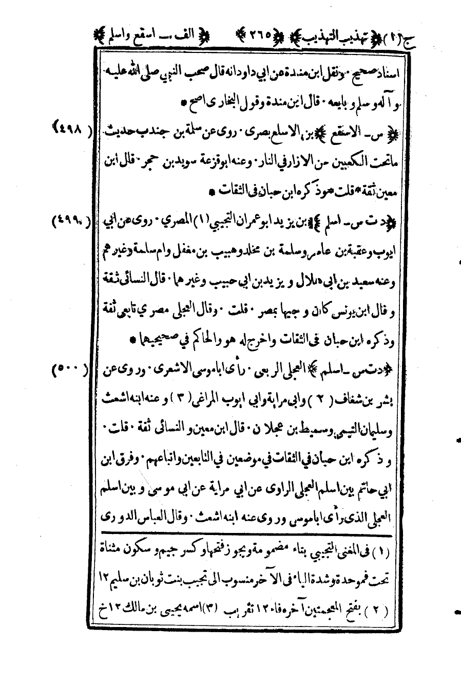 500 ـ "د ت س - أسلم" العجلي الربعي. رأي أبا موسى الأشعري. وروى عن بشر بن شغاف2 وأبي مراية وأبي أيوب المراغي3. وعنه ابنه أشعث وسليمان التيمي وسميط بن عجلان. قال ابن معين والنسائي: "ثقة". قلت: وذكره ابن حبان في الثقات في موضعين في التابعين وأتباعهم وفرق ابن أبي حاتم بين أسلم العجلي الراوي عن أبي مراية عن أبي موسى وبين أسلم العجلي الذي رأى أبا موسى وروى عنه ابنه اشعث. وقال العباس الدوري