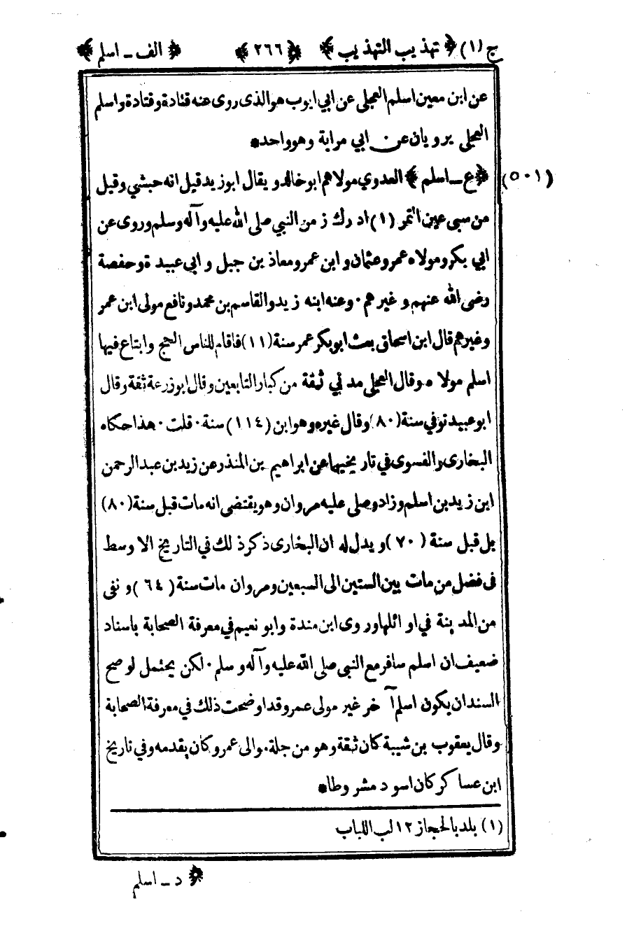 501 ـ "ع - أسلم" العدوي مولاهم أبو خالد ويقال أبو زيد. قيل إنه حبشي وقيل من سبي عين التمر1 أدرك زمن النبي صلى الله عليه وآله وسلم وروى عن أبي بكر ومولاه عمر وعثمان وابن عمر ومعاذ بن جبل وأبي عبيد وحفصة -رضى الله تعالى عنهم- وغيرهم. وعنه ابنه زيد والقاسم بن محمد ونافع مولى ابن عمر وغيرهم. قال ابن إسحاق بعث أبو بكر عمر سنة "11" فأقام للناس الحج وابتاع فيها أسلم مولاه. وقال العجلي: "مدني ثقة من كبار التابعين" وقال أبو زرعة: "ثقة" وقال أبو عبيد توفي سنة "80" وقال غيره وهو ابن "114" سنة. قلت: هذا حكاه البخاري والفسوي في تاريخيهما عن إبراهيم بن المنذر عن زيد بن عبد الرحمن بن زيد بن أسلم وزاد صلى عليه مروان وهو يقتضى أنه مات قبل سنة "80" بل قيل سنة "70" ويدل له أن البخاري ذكر ذلك في التاريخ الأوسط في فضل من مات بين الستين إلى السبعين ومروان مات سنة "64" ونفي من المدينة في أوائلها. وروى ابن مندة وأبو نعيم في معرفة الصحابة بإسناد ضعيف أن أسلم سافر مع النبي صلى الله عليه وآله وسلم. لكن يحتمل لو صح السند أن يكون أسلم آخر غير مولى عمر وقد أوضحت ذلك في معرفة الصحابة وقال يعقوب بن شيبة: "كان ثقة وهو من جلة موالي عمر وكان يقدمه" وفي تاريخ ابن عساكر: "كان أسود مشروطا.
