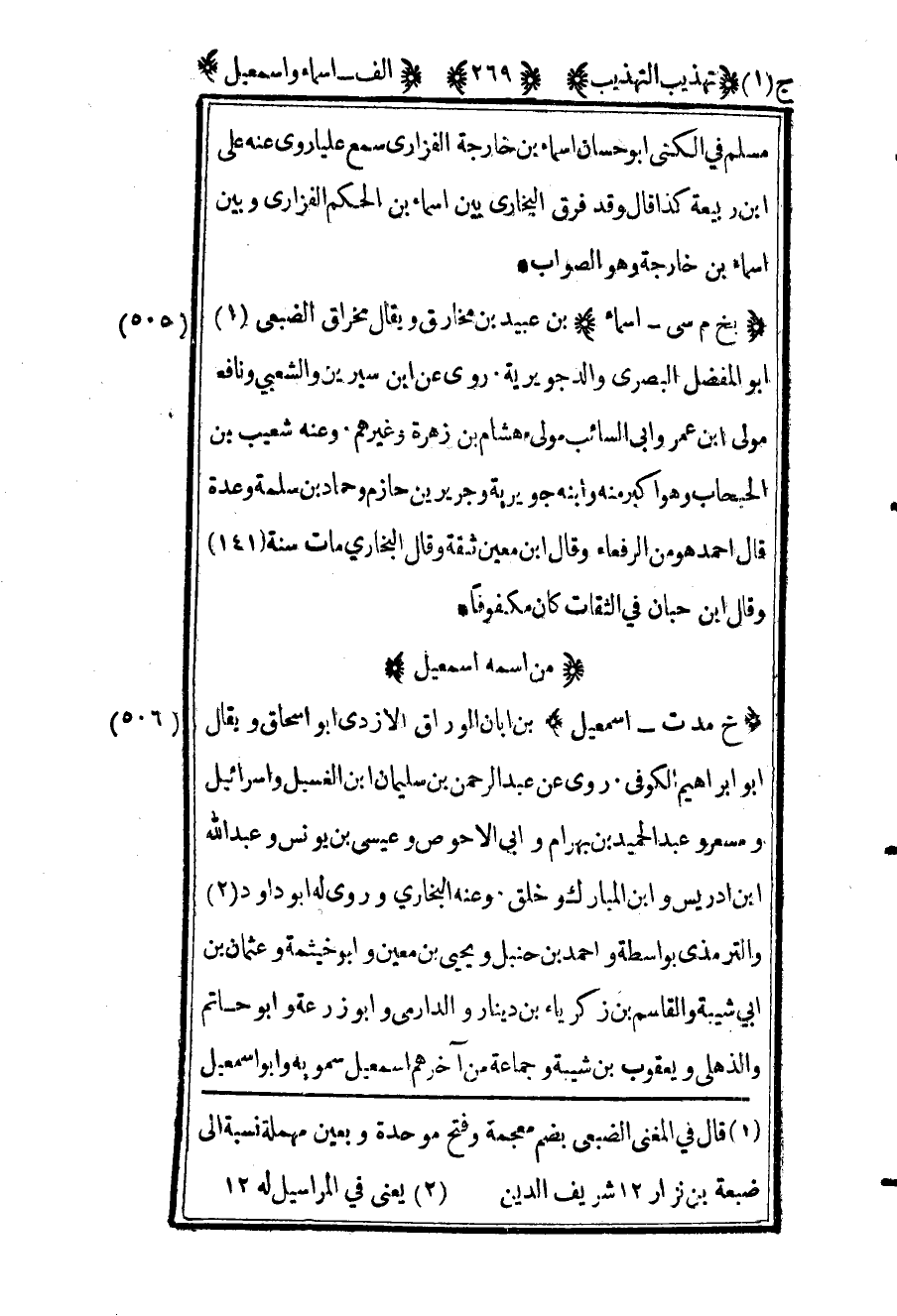 505 ـ "بخ م سي - أسماء" بن عبيد بن مخارق ويقال مخراق الضبعي1 أبو المفضل البصري والد جويرية. روى عن بن سيرين والشعبي ونافع مولى بن عمر وأبي السائب مولى هشام بن زهرة وغيرهم. وعنه شعيب ابن الحبحاب وهو أكبر منه وابنه جويرية وجرير بن حازم وحماد بن سلمة وعدة. قال أحمد: "هو من الرفعاء" وقال ابن معين: "ثقة", وقال البخاري: مات سنة "141" وقال ابن حبان في الثقات: "كان مكفوفا".