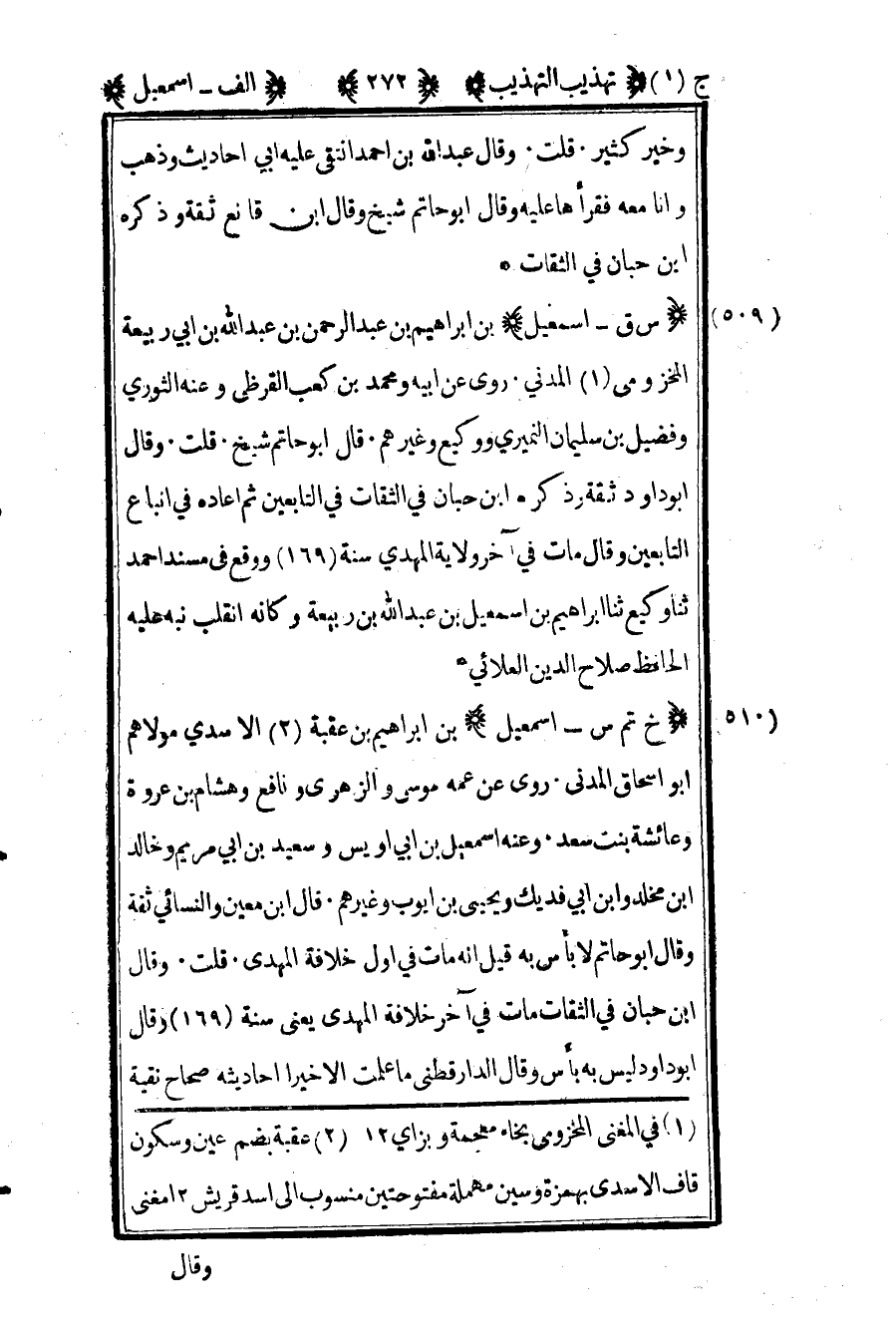 510 ـ "خ تم س - إسماعيل" بن إبراهيم بن عقبة2 الأسدي مولاهم أبو إسحاق المدني. روى عن عمه موسى والزهري ونافع وهشام بن عروة وعائشة بنت سعد وعنه إسماعيل بن أبي أويس وسعيد بن أبي مريم وخالد بن مخلد وابن أبي فديك ويحيى بن أيوب وغيرهم. قال ابن معين والنسائي: "ثقة" وقال أبو حاتم: "لا بأس به" قيل أنه مات في أول خلافة المهدي. قلت: وقال ابن حبان في الثقات مات في آخر خلافة المهدي يعني سنة "169" وقال أبو داود: "ليس به بأس" وقال الدارقطني: "ما علمت إلا خيرا أحاديثه صحاح نقية".