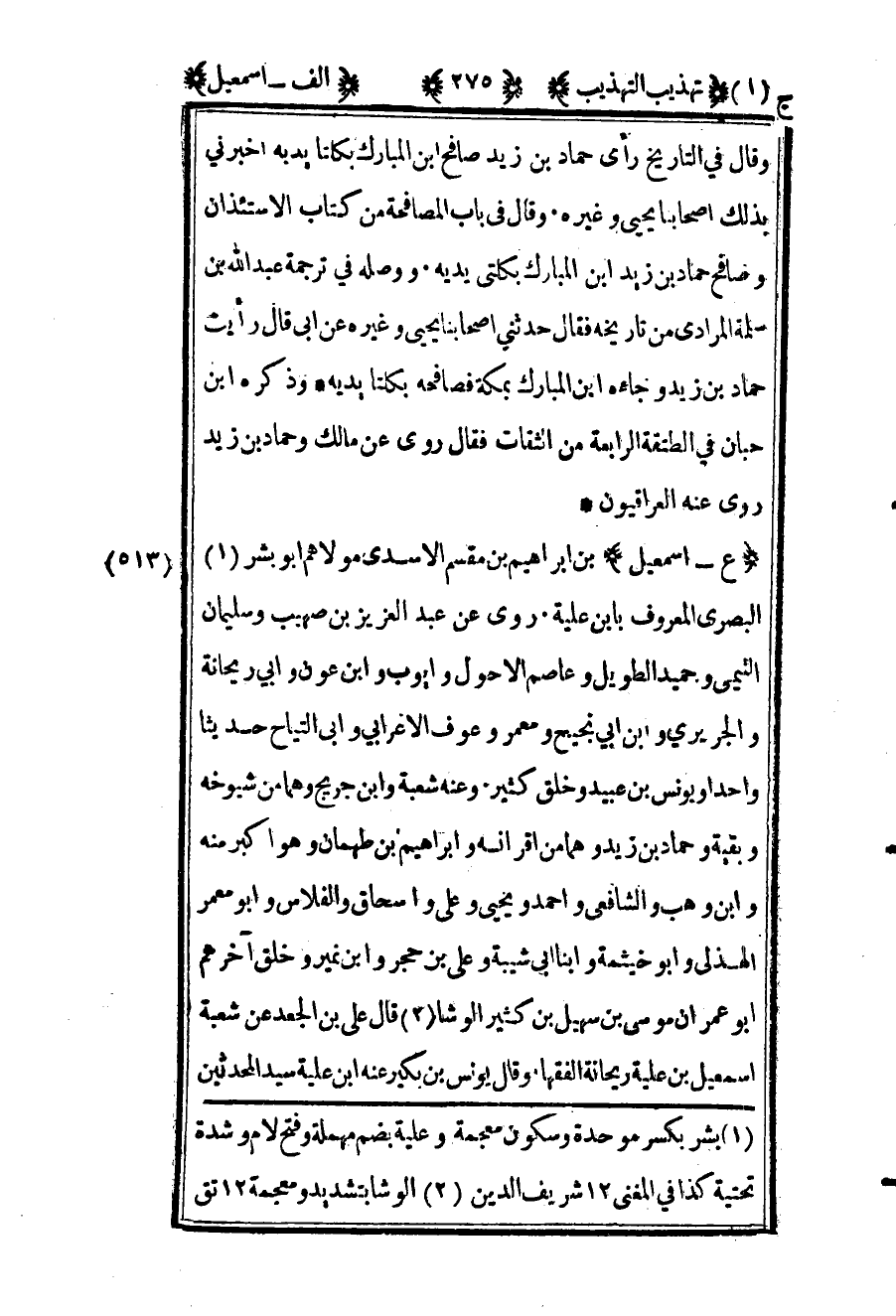 513 ـ "ع - إسماعيل" بن إبراهيم بن مقسم الأسدي مولاهم أبو بشر1 البصري المعروف بابن علية. روى عن عبد العزيز بن صهيب وسليمان التيمي وحميد الطويل وعاصم الأحول وأيوب وابن عون وأبي ريحانة والجريري وابن أبي نجيح ومعمر وعوف الأعرابي وأبي التياح حديثا واحدا, ويونس بن عبيد وخلق كثير. وعنه شعبة وابن جريج وهما من شيوخه وبقية وحماد بن زيد وهما من أقرانه وإبراهيم بن طهمان وهو أكبر منه وابن وهب والشافعي وأحمد ويحيى وعلى وإسحاق والفلاس وأبو معمر الهذلي وأبو خيثمة وابنا أبي شيبة وعلي بن حجر وابن نمير وخلق آخرهم أبو عمران موسى بن سهيل كثير الوشا2. قال علي بن الجعد عن شعبة إسماعيل بن علية: "ريحانة الفقهاء" وقال يونس بن بكير عنه: "ابن علية سيد المحدثين"