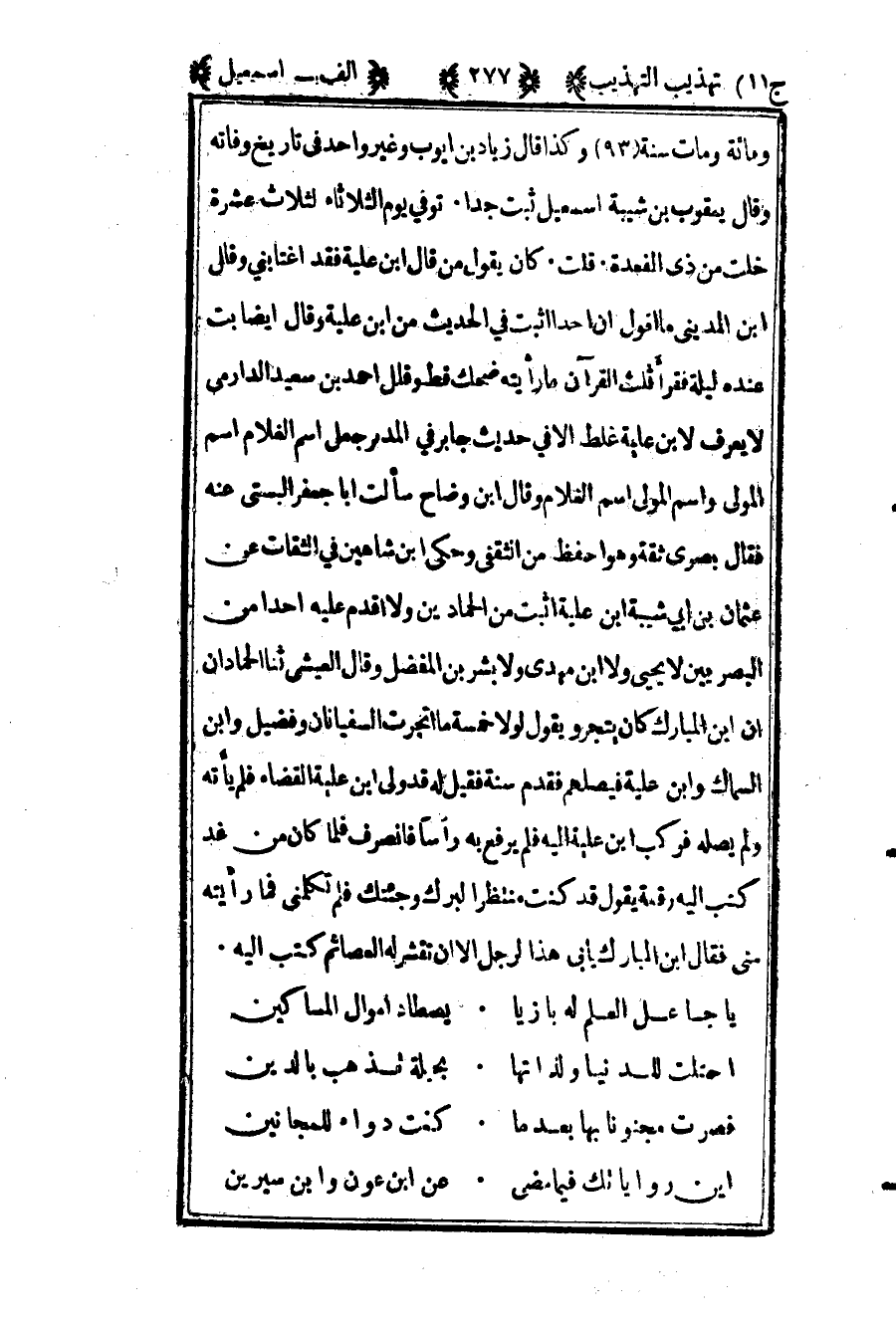 ومائة ومات سنة "93" وكذا قال زياد بن أيوب وغير واحد في تاريخ وفاته. وقال يعقوب بن شيبة: "إسماعيل ثبت جدا". توفي يوم الثلاثاء لثلاث عشرة خلت من ذي القعده. قلت: "كان يقول: من قال: ابن علية فقد اغتابني" وقال ابن المديني: "ما أقول أن أحدا أثبت في الحديث من ابن علية" وقال أيضا: "بت عنده ليلة فقرأ ثلث القرآن ما رأيته ضحك قط" وقال أحمد بن سعيد الدارمي: "لا يعرف لابن علية غلط إلا في حديث جابر في المدبر جعل اسم الغلام اسم المولى واسم المولى اسم الغلام" وقال ابن وضاح سألت أبا جعفر البستي عنه فقال: "بصري ثقة وهو أحفظ من الثقفي" وحكى ابن شاهين في الثقات عن عثمان بن أبي شيبة: "ابن علية أثبت من الحمادين ولا أقدم عليه أحدا من البصريين لا يحيى ولا ابن مهدي ولا بشر بن المفضل" وقال العيشي: "ثنا الحمادان أن ابن المبارك كان يتجر ويقول لولا خمسة ما اتجرت السفيانان وفضيل وابن السماك وابن علية فيصلهم" فقدم سنة فقيل له قد ولي ابن علية القضاء فلم يأته ولم يصله فركب ابن علية إليه فلم يرفع به رأسا فانصرف فلما كان من غد كتب إليه رقعة يقول قد كنت منتظرا لبرك وجئتك فلم تكلمني فما رأيته مني فقال ابن المبارك: "يأبى هذا الرجل إلا أن تقشر له العصا" ثم كتب إليه: