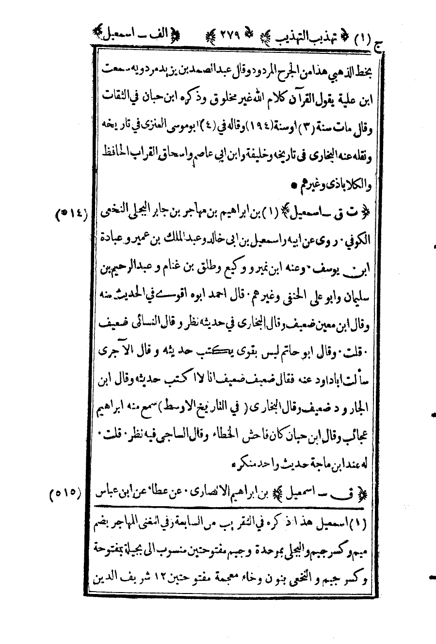 1 -إسماعيل هذا ذكره في التقريب من السابعة وفي المغني المهاجر بضم ميم وكسر جيم والبجلي بموحدة وجيم مفتوحتين منسوب إلى بجيلة بمفتوحة وكسر جيم والنخعي بنون وخاء معجمة مفتوحتين 12 شريف الدين