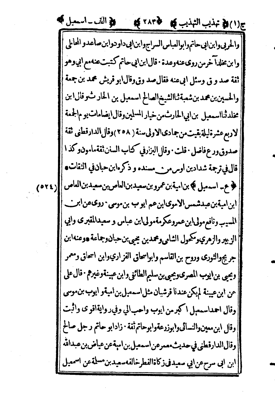 524 ـ "ع - إسماعيل" بن أمية بن عمرو بن سعيد بن العاص بن سعيد بن العاص بن أمية بن عبد شمس الأموي بن عم أيوب بن موسى. روى عن ابن المسيب ونافع مولى ابن عمر وعكرمة مولى ابن عباس وسعيد المقبري وأبي الزبير والزهري ومكحول الشامي ومحمد بن يحيى بن حبان وجماعة. وعنه ابن جريج والثوري وروح بن القاسم وأبو إسحاق الفزاري وابن إسحاق ومعمر ويحيى بن أيوب المصري ويحيى بن سليم الطائفي وابن عيينة وغيرهم. قال علي عن ابن عيينة: "لم يكن عندنا قرشيان مثل إسماعيل بن أمية وأيوب بن موسى" وقال أحمد: "إسماعيل أكبر من أيوب وأحب إلي" وفي رواية: "أقوى وأثبت" وقال ابن معين والنسائي وأبو زرعة وأبو حاتم: "ثقة زاد أبو حاتم رجل صالح" وقال الدارقطني في حديث معمر عن إسماعيل بن أمية عن عياض بن عبد الله بن أبي سرج عن أبي سعيد في "زكاة الفطر" خالفه سعيد بن مسلمة عن إسماعيل