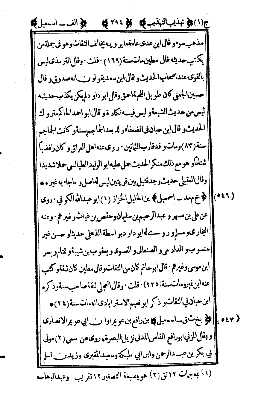 546 ـ "خ م مد - إسماعيل" بن الخليل الخزاز1 أبو عبد الله الكوفي. روى عن علي بن مسهر وعبد الرحيم بن سليمان وحفص بن غياث وغيرهم. وعنه البخاري ومسلم. وروى له أبو داود بواسطة الذهلي حديثا وحسن غير منسوب والدارمي والصنعاني والفسوى ويعقوب بن شيبة وتمتام وبسر بن موسى وغيرهم. قال أبو حاتم: "كان من الثقات" وقال مطين: "كان ثقة" وكتب عنه بن نمير ومات سنة "225" قلت: وقال العجلي: "ثقة صاحب سنة" وذكره ابن حبان في الثقات وذكر أبو نعيم الإسترابادي أنه مات سنة "24".