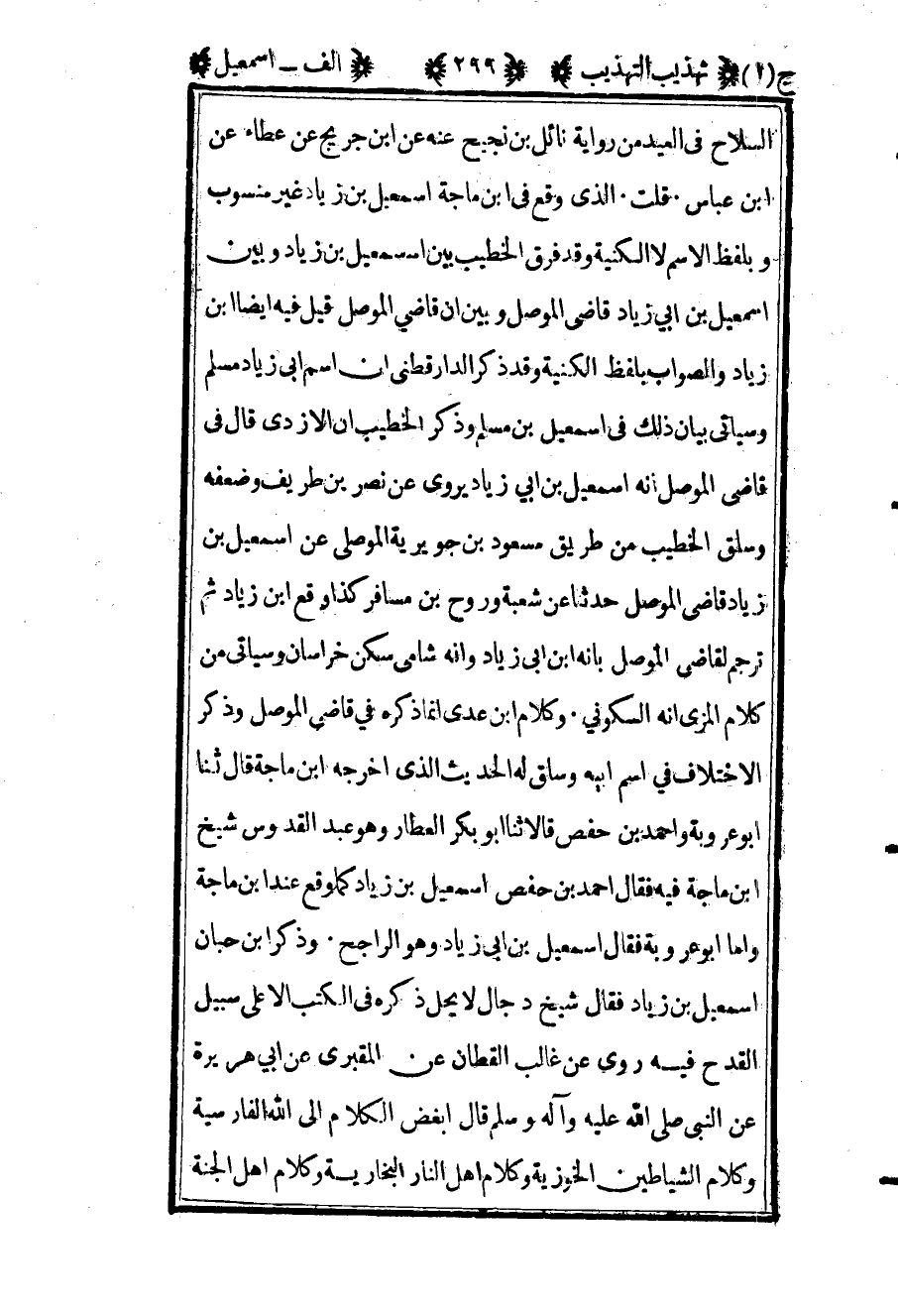 السلاح في العيد من رواية نائل بن نجيح عنه عن ابن جريج عن عطاء عن ابن عباس". قلت: الذي وقع في ابن ماجة إسماعيل بن زياد غير منسوب وبلفظ الاسم لا الكنية وقد فرق الخطيب بين إسماعيل بن زياد وبين إسماعيل بن أبي زياد قاضي الموصل وبين أن قاضي الموصل قيل فيه أيضا ابن زياد والصواب بلفظ الكنية وقد ذكر الدارقطني أن اسم أبي زياد مسلم وسيأتي بيان ذلك في إسماعيل بن مسلم وذكر الخطيب أن الأزدي قال في قاضي الموصل أنه إسماعيل بن أبي زياد يروي عن نصر بن طريف وضعفه وسلق الخطيب من طريق مسعود بن جويرية الموصلي عن إسماعيل بن زياد قاضي الموصل حدثنا عن شعبة وروح بن مسافر كذا وقع ابن زياد ثم ترجم لقاضي الموصل بأنه ابن أبي زياد وأنه شامي سكن خراسان وسيأتي من كلام المزي أنه السكوني. وكلام ابن عدي إنما ذكره في قاضي الموصل وذكر الاختلاف في اسم أبيه وساق له الحديث الذي أخرجه ابن ماجة قال ثنا أبو عروبة وأحمد بن حفص قالا ثنا أبو بكر العطار وهو عبد القدوس شيخ ابن ماجة فيه فقال أحمد بن حفص إسماعيل بن زياد كما وقع عند ابن ماجة وأما أبو عروبة فقال إسماعيل ابن أبي زياد وهو الراجح وذكر ابن حبان إسماعيل بن زياد فقال: "شيخ دجال لا يحل ذكره في الكتب إلا على سبيل القدح فيه" روى عن غالب القطان عن المقبري عن أبي هريرة عن النبي صلى الله عليه وآله وسلم: "قال أبغض الكلام إلى الله الفارسية وكلام الشياطين الخوزية وكلام أهل النار البخارية وكلام أهل الجنة