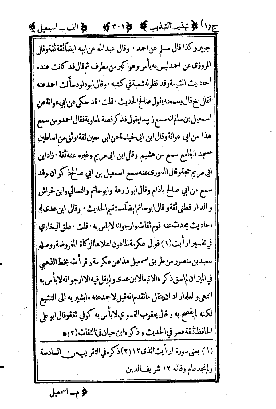جبير" وكذا قال مسلم عن أحمد. وقال عبد الله عن أبيه أيضا: "ثقة ثقة", وقال المروزي عن أحمد: "ليس به بأس وهو أكبر من مطرف" ثم قال قد كانت عنده أحاديث الشيعة وقد نظر له شعبة في كتبه وقال أبو داود سألت أحمد عنه فقال: "بخ", قال وسمعته يقول: "صالح الحديث". قلت قد حكى عن أبي عوانة عن إسماعيل ابن سالم أنه سمع زبيدا يقول فذكر قصة لمعاوية فقال أحمد ومن سمع هذا من أبي عوانة وقال ابن أبي خيثمة عن ابن معين: "ثقة أوثق من أساطين مسجد الجامع سمع من هشيم" وقال ابن أبي مريم وغيره عنه: "ثقة" زاد ابن أبي مريم: "حجة" وقال الدوري عنه سمع إسماعيل بن أبي صالح ذكوان وقد سمع من أبي صالح باذام وقال أبو زرعة وأبو حاتم والنسائي وابن خراش والدارقطني: "ثقة" وقال أبو حاتم أيضا: "مستقيم الحديث" وقال ابن عدي: "له أحاديث يحدث عنه قوم ثقات وأرجو أنه لا بأس به". قلت: "علق البخاري في تفسير {أَرَأَيْتَ} 1 قول عكرمة: "الماعون أعلاها الزكاة المفروضة" ووصله سعيد بن منصور من طريق إسماعيل هذا عن عكرمة وقرأت بخط الذهبي في الميزان لم أسق ذكره إلا تبعا لابن عدي ولم يقل فيه إلا أرجو أنه لا بأس به انتهى. ولعله أراد أن ينقل ما تقدم أنه لأحمد عنه ما يشير به إلى التشيع لكنه لم يفصح به وقال يعقوب الفسوي: "لا بأس به كوفي ثقة", وقال أبو علي الحافظ: "ثقة عسر في الحديث" وذكره ابن حبان في الثقات2.