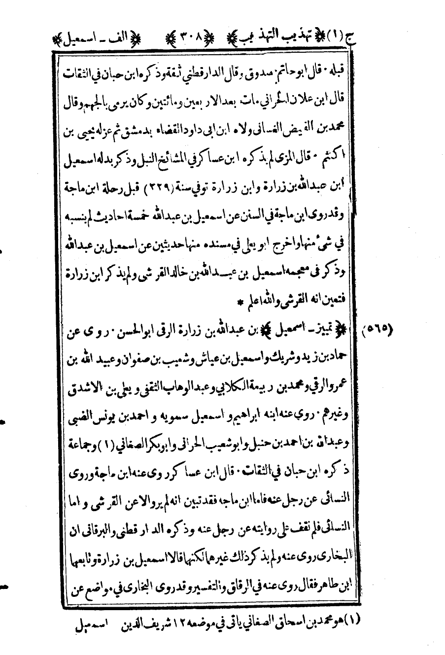 قبله. قال أبو حاتم: "صدوق", وقال الدارقطني: "ثقة", وذكره ابن حبان في الثقات قال ابن علان الحراني مات بعد الأربعين ومائتين وكان يرمى بالجهم وقال محمد بن الفيض الغساني ولاه ابن أبي داود القضاء بدمشق ثم عزله يحيى بن أكثم. قال المزي: لم يذكره ابن عساكر في المشائخ النبل وذكر بدله إسماعيل بن عبد الله بن زرارة وابن زرارة توفي سنة "229" قبل رحلة ابن ماجة. وقد روى ابن ماجة في السنن عن إسماعيل ابن عبد الله خمسة أحاديث لم ينسبه في شيء منها وأخرج أبو يعلى في مسنده منها حديثين عن إسماعيل بن عبد الله وذكر في معجمه إسماعيل بن عبد الله بن خالد القرشي ولم يذكر ابن زرارة فتعين أنه القرشي والله أعلم.