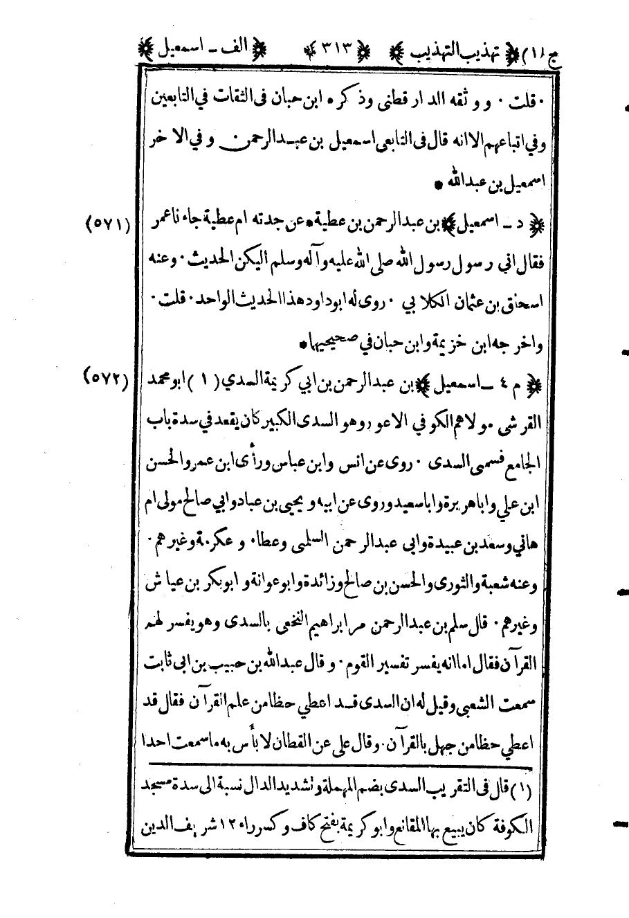 572 ـ "م 4 - إسماعيل" بن عبد الرحمن بن أبي كريمة السدي1 أبو محمد القرشي مولاهم الكوفي الأعور وهو السدي الكبير كان يقعد في سدة باب الجامع فسمى السدي. روى عن أنس وابن عباس ورأى ابن عمر والحسن بن علي وأبا هريرة وأبا سعيد وروى عن أبيه ويحيى بن عباد وأبي صالح مولى أم هاني وسعد ابن عبيدة وأبي عبد الرحمن السلمي وعطاء وعكرمة وغيرهم. وعنه شعبة والثوري والحسن بن صالح وزائدة وأبو عوانة وأبو بكر بن عياش وغيرهم. قال سلم بن عبد الرحمن مر إبراهيم النخعي بالسدي وهو يفسر لهم القرآن فقال أما أنه يفسر تفسير القوم. وقال عبد الله بن حبيب بن أبي ثابت سمعت الشعبي وقيل له أن السدي قد أعطى حظا من علم القرآن فقال قد أعطى حظا من جهل بالقرآن وقال علي عن القطان: "لا بأس به ما سمعت أحدا