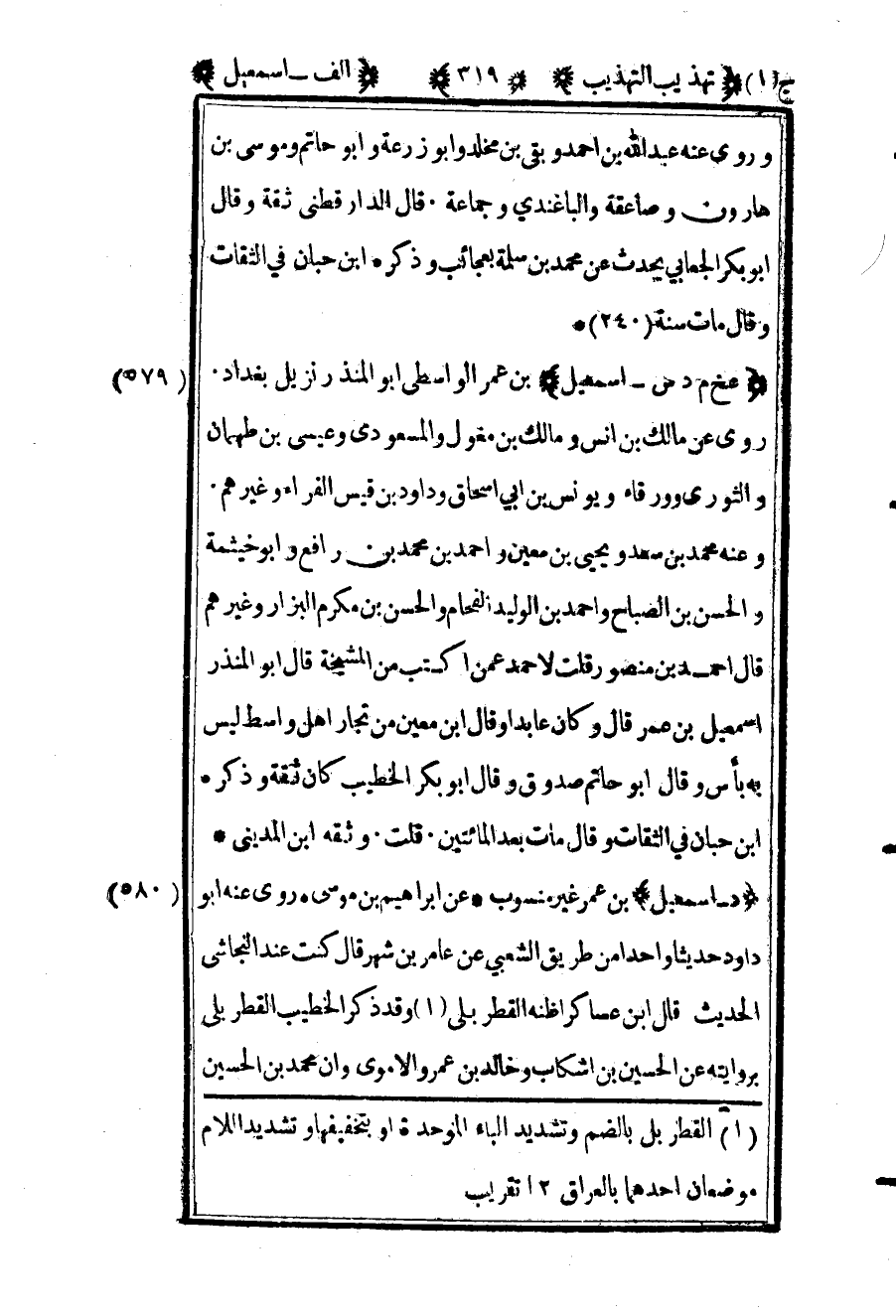 580 ـ "د - إسماعيل" بن عمر غير منسوب. عن إبراهيم بن موسى. روى عنه أبو داود حديثا واحدا من طريق الشعبي عن عامر بن شهر قال: "كنت عند النجاشي" الحديث. قال ابن عساكر: أظنه القطربلي وقد ذكر الخطيب القطربلي1 بروايته عن الحسين بن أشكاب وخالد بن عمرو الأموي وأن محمد بن الحسين