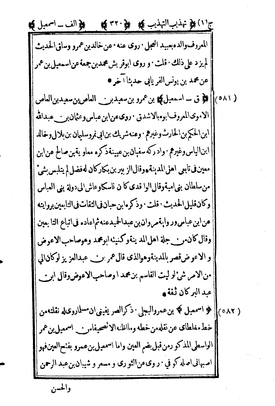 582 ـ "إسماعيل" بن عمرو البجلي ذكر الصريفيني أن مسلما روى له نقلته من خط مغلطاي عن نقله من خطه وما أظنه إلا تصحيفا من إسماعيل بن عمر الواسطي المذكور من قبل بضم العين وأما إسماعيل بن عمرو بفتح العين فهو أصبهاني أصله كوفي. روى عن الثوري ومسعر وشيبان بن عبد الرحمن
