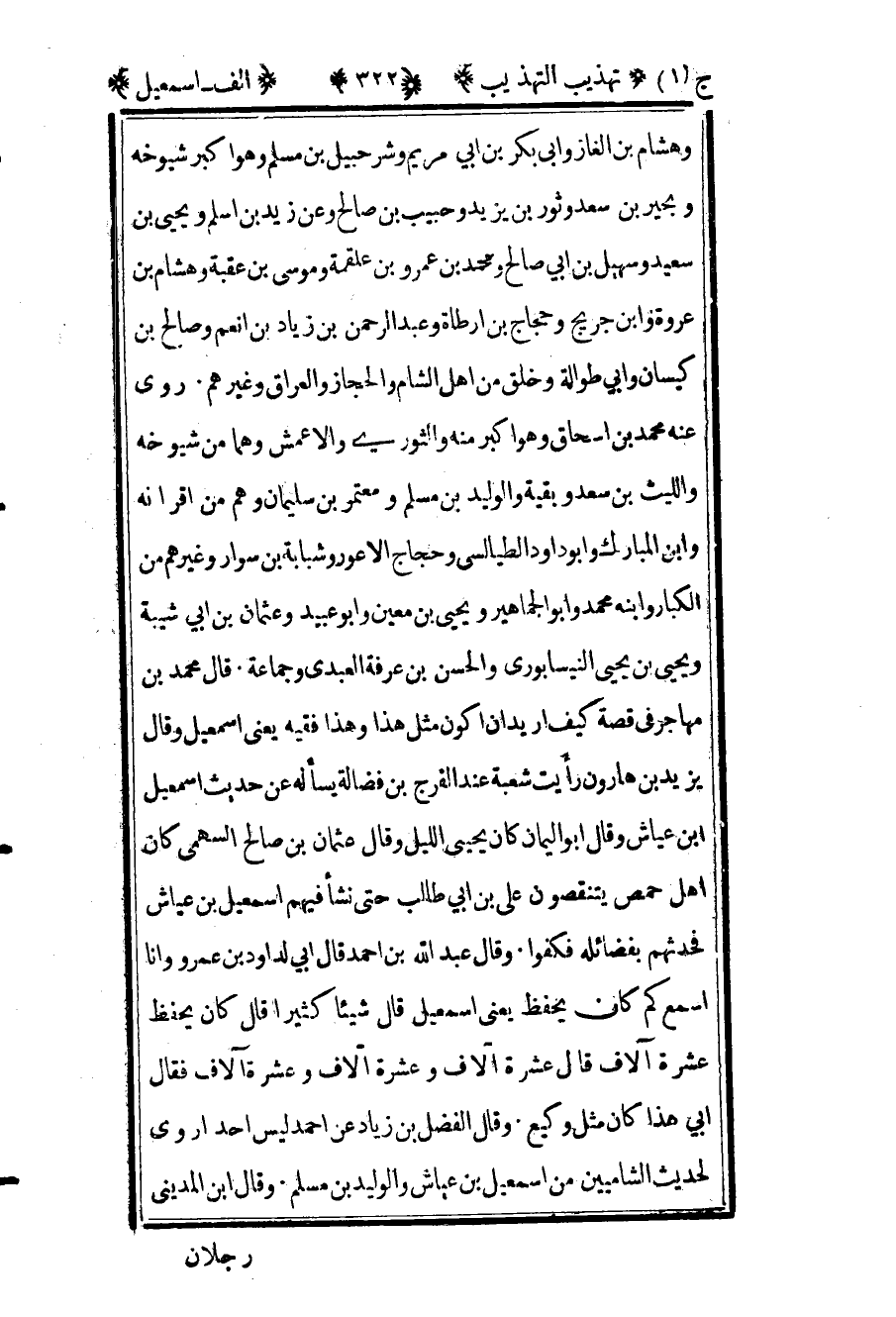 وهشام بن الغاز وأبي بكر بن أبي مريم وشرحبيل بن مسلم وهو أكبر شيوخه وبحير بن سعد وثور بن يزيد وحبيب بن صالح وعن زيد بن أسلم ويحيى بن سعيد وسهيل بن أبي صالح ومحمد بن عمرو بن علقمة وموسى بن عقبة وهشام بن عروة وابن جريج وحجاج بن أرطاة وعبد الرحمن بن زياد بن أنعم وصالح بن كيسان وأبي طوالة وخلق من أهل الشام والحجاز والعراق وغيرهم. روى عنه محمد بن إسحاق وهو أكبر منه والثوري والأعمش وهما من شيوخه والليث بن سعد وبقية والوليد بن مسلم ومعتمر بن سليمان وهم من أقرانه وابن المبارك وأبو داود الطيالسي وحجاج الأعور وشبابة بن سوار وغيرهم من الكبار وابنه محمد وأبو الجماهير ويحيى بن معين وأبو عبيد وعثمان بن أبي شيبة ويحيى بن يحيى النيسابوري والحسن بن عرفة العبدي وجماعة. قال محمد بن مهاجر في قصة كيف أريد أن أكون مثل هذا وهذا فقيه؟ يعني إسماعيل وقال يزيد بن هارون رأيت شعبة عند الفرج بن فضالة يسأله عن حديث إسماعيل بن عياش وقال أبو اليمان كان يحيى الليل وقال عثمان بن صالح السهمي كان أهل حمص يتنقصون علي بن أبي طالب حتى نشأ فيهم إسماعيل بن عياش فحدثهم بفضائله فكفوا. وقال عبد الله بن أحمد قال أبي لداود بن عمرو وأنا أسمع كم كان يحفظ يعني إسماعيل قال: "شيئا كثيرا" قال: "كان يحفظ عشرة آلاف. قال: عشرة آلاف وعشرة آلاف وعشرة آلاف فقال أبي: "هذا كان مثل وكيع" وقال الفضل بن زياد عن أحمد: "ليس أحد أروى لحديث الشاميين من إسماعيل بن عياش والوليد بن مسلم" وقال ابن المديني: