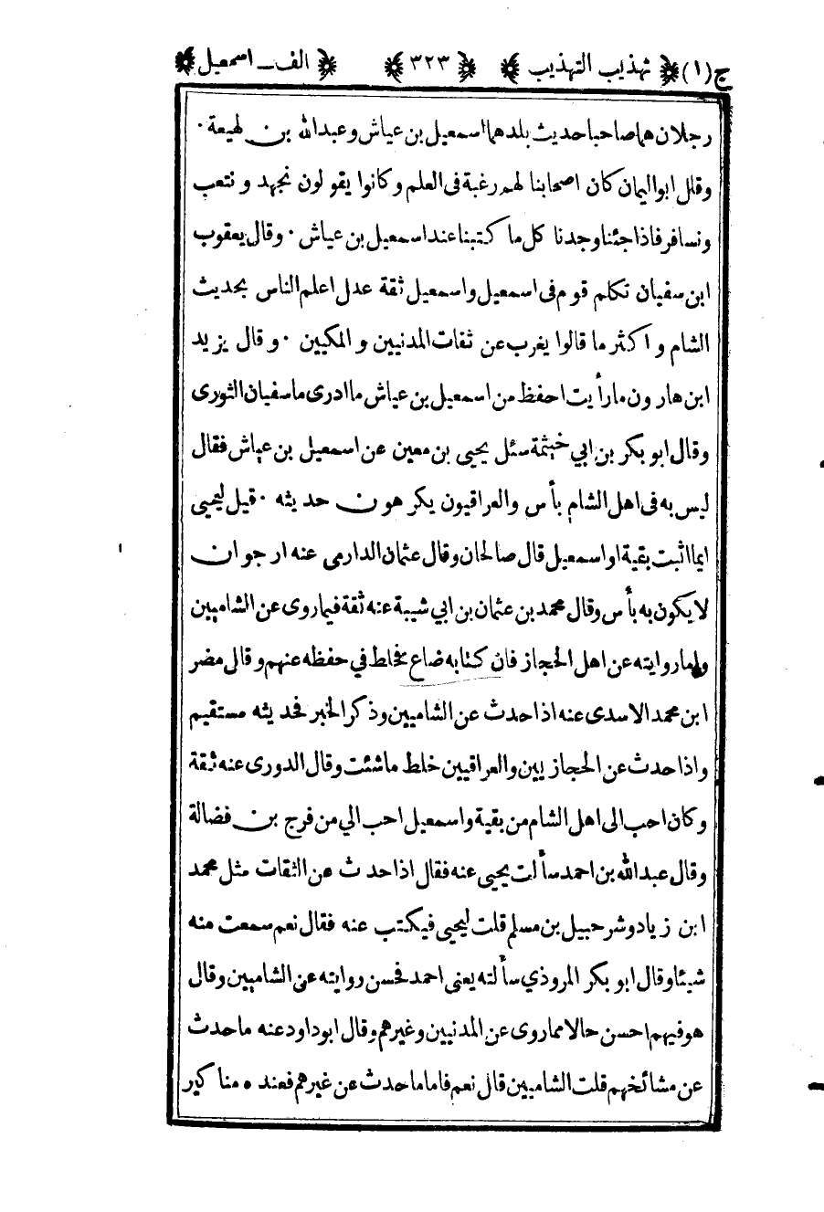 رجلان هما صاحبا حديث بلدهما إسماعيل بن عياش وعبد الله بن لهيعة. وقال أبو اليمان كان أصحابنا لهم رغبة في العلم وكانوا يقولون: "نجهد ونتعب ونسافر فإذا جئنا وجدنا كل ما كتبنا عند إسماعيل بن عياش". وقال يعقوب بن سفيان: "تكلم قوم في إسماعيل وإسماعيل ثقة عدل أعلم الناس بحديث الشام وأكثر ما قالوا يغرب عن ثقات المدنيين والمكيين" وقال يزيد بن هارون: "ما رأيت أحفظ من إسماعيل بن عياش ما أدري ما سفيان الثوري" وقال أبو بكر بن أبي خيثمة سئل يحيى بن معين عن إسماعيل بن عياش فقال: "ليس به في أهل الشام بأس والعراقيون يكرهون حديثه" قيل ليحيى أيما أثبت بقية أو إسماعيل قال: "صالحان" وقال عثمان الدارمي عنه: أرجو أن لا يكون به بأس" وقال محمد بن عثمان بن أبي شيبة عنه: "ثقة فيما روى عن الشاميين وأما روايته عن أهل الحجاز فإن كتابه ضاع فخلط في حفظه عنهم" وقال مضر بن محمد الأسدي عنه: "إذا حدث عن الشاميين وذكر الخبر فحديثه مستقيم وإذا حدث عن الحجازيين والعراقيين خلط ما شئت" وقال الدوري عنه: "ثقة وكان أحب إلى أهل الشام من بقية وإسماعيل أحب إلي من فرج بن فضالة" وقال عبد الله بن أحمد سألت يحيى عنه فقال: "إذا حدث عن الثقات مثل محمد بن زياد وشرحبيل بن مسلم" قلت ليحيى: فيكتب عنه فقال: "نعم سمعت منه شيئا" وقال أبو بكر المروذي سألته يعني أحمد "فحسن روايته عن الشاميين وقال هو فيهم أحسن حالا مما روى عن المدنيين وغيرهم" وقال أبو داود عنه: "ما حدث عن مشائخهم" قلت: الشاميين قال: "نعم فأما ما حدث عن غيرهم فعنده مناكير"
