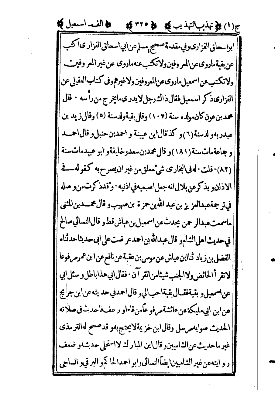أبو إسحاق الفزاري" وفي مقدمة صحيح مسلم عن أبي إسحاق الفزاري اكتب عن بقية ما روى عن المعروفين ولا تكتب عنه ما روى عن غير المعروفين ولا تكتب عن إسماعيل ما روى عن المعروفين ولا غيرهم" وفي كتاب العقيلي عن الفزاري ذكر إسماعيل فقال: "ذاك رجل لا يدري ما يخرج من رأسه". قال محمد بن عون كان مولده سنة "102" وقال بقية ولد سنة "5" وقال زيد بن عبد ربه ولد سنة "6" وكذا قال ابن عيينة وأحمد بن حنبل وقال أحمد وجماعة مات سنة "181" وقال محمد بن سعد وخليفة وأبو عبيد مات سنة "82". قلت: له في البخاري شيء معلق من غير أن يصرح به كقوله في الأذان: "ويذكر عن بلال أنه جعل أصبعيه في أذنيه". وقد ذكرت من وصله في ترجمة عبد العزيز بن عبد الله بن حمزة بن صهيب وقال محمد بن المثنى ما سمعت عبد الرحمن يحدث عن إسماعيل بن عياش قط وقال النسائي: "صالح في حديث أهل الشام" وقال عبد الله بن أحمد عرضت على أبي حديثا حدثناه الفضل بن زياد ثنا ابن عياش عن موسى بن عقبة عن نافع عن بن عمر مرفوعا: "لا تقرأ الحائض ولا الجنب شيئا من القرآن". فقال أبي: "هذا باطل" وسئل أبي عن إسماعيل وبقية فقال: "بقية أحب إلي" وقال أحمد في حديثه عن ابن جريج عن ابن أبي مليكة عن عائشة مرفوعا: "من قاء أو رعف فأحدث في صلاته" الحديث. صوابه مرسل. وقال ابن خزيمة: "لا يحتج به" وقد صحح له الترمذي غير ما حديث عن الشاميين وقال ابن المبارك: "لا استحلي حديثه" وضعف روايته عن غير الشاميين أيضا النسائي وأبو أحمد الحاكم والبرقي والساجي
