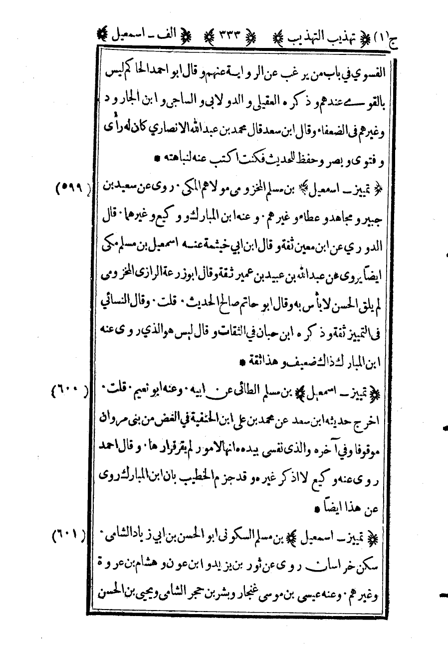 600 ـ "تمييز- إسماعيل" بن مسلم الطائي عن أبيه وعنه أبو نعيم. قلت: أخرج حديثه ابن سعد عن محمد بن علي بن الحنفية في "الغض من بني مروان" موقوفا وفي آخره: "والذي نفسي بيده إنها لأمور لم يقر قرارها". وقال أحمد: "روى عنه وكيع لا أذكر غيره" وقد جزم الخطيب بأن ابن المبارك روى عن هذا أيضا.