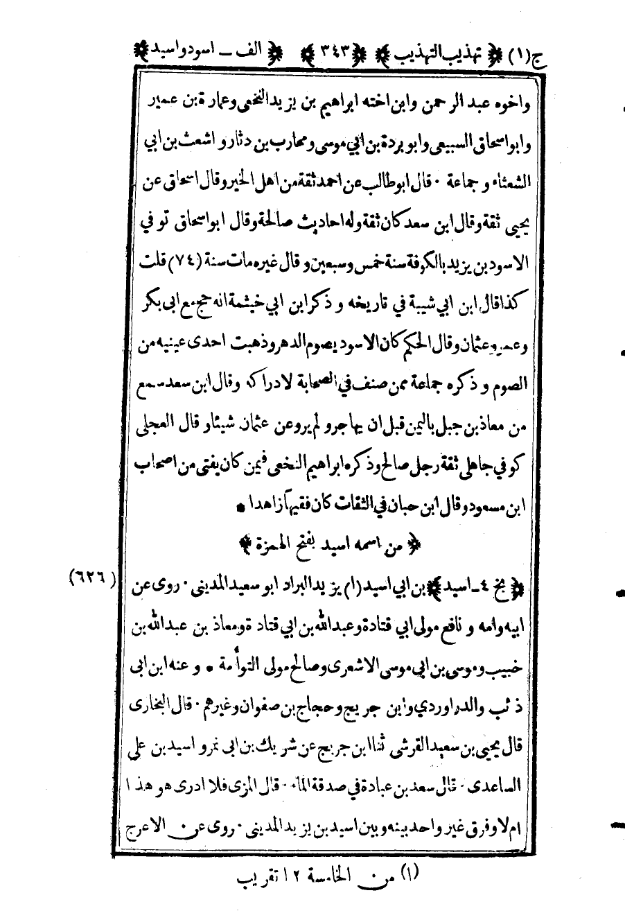 626 ـ "بخ 4 - أسيد" بن أبي أسيد1 يزيد البراد أبو سعيد المديني. روى عن أبيه وأمه ونافع مولى أبي قتادة وعبد الله بن أبي قتادة ومعاذ بن عبد الله بن خبيب وموسى بن أبي موسى الأشعري وصالح مولى التوأمة. وعنه بن أبي ذئب والداروردي وابن جريج وحجاج بن صفوان وغيرهم. قال البخاري: قال يحيى بن سعيد القرشي: ثنا ابن جريج عن شريك بن أبي نمر وأسيد بن على الساعدي قال سعد بن عبادة في صدقة الماء: قال المزي: فلا أرى هو هذا أم لا؟ وفرق غير واحد بينه وبين أسيد بن يزيد المديني. روى عن الأعرج