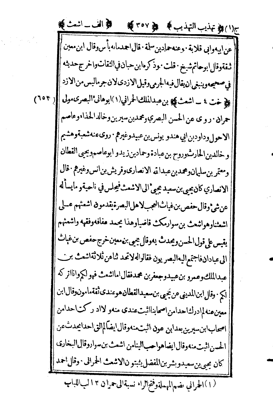 652 ـ "خت 4 - أشعث" بن عبد الملك الحمراني1 أبو هانئ البصري مولى حمران. روى عن الحسن البصري ومحمد بن سيرين وخالد الحذاء وعاصم الأحول وداود بن أبي هند ويونس ابن عبيد وغيرهم. روى عنه شعبة وهشيم وخالد بن الحارث وروح بن عبادة وحماد بن زيد وأبو عاصم ويحيى القطان ومعتمر بن سليمان ومحمد بن عبد الله الأنصاري وقريش بن أنس وغيرهم. قال الأنصاري: كان يحيى بن سعيد يجيء إلى الأشعث فيجلس في ناحية وما يسأله عن شيء وقال حفص بن غياث العجب لأهل البصرة يقدمون أشعثهم على أشعثنا وهو أشعث بن سوار مكث قاضيا وهذا يحمد عفافه وفقهه وأشعثهم يقيس على قول الحسن ويحدث به وقال يحيى بن معين: خرج حفص بن غياث إلى عبادان فاجتمع إليه البصريون فقالوا له: لا تحدثنا عن ثلاثة أشعث بن عبد الملك وعمرو بن عبيد وجعفر بن محمد فقال أما أشعث فهو لكم وأنا أتركه لكم وقال ابن المديني عن يحيى بن سعيد القطان وهو عندي: "ثقة مأمون", وقال ابن معين عنه: لم أدرك أحدا من أصحابنا أثبت عندي منه ولا أدركت أحدا من أصحاب ابن سيرين بعد بن عون أثبت منه وقال أيضا: لم ألق أحدا يحدث عن الحسن أثبت منه وقال أيضا: هو أحب إلينا من أشعث بن سوار, وقال البخاري: كان يحيى بن سعيد وبشر بن المفضل يثبتون الأشعث الحمراني وقال أحمد:
