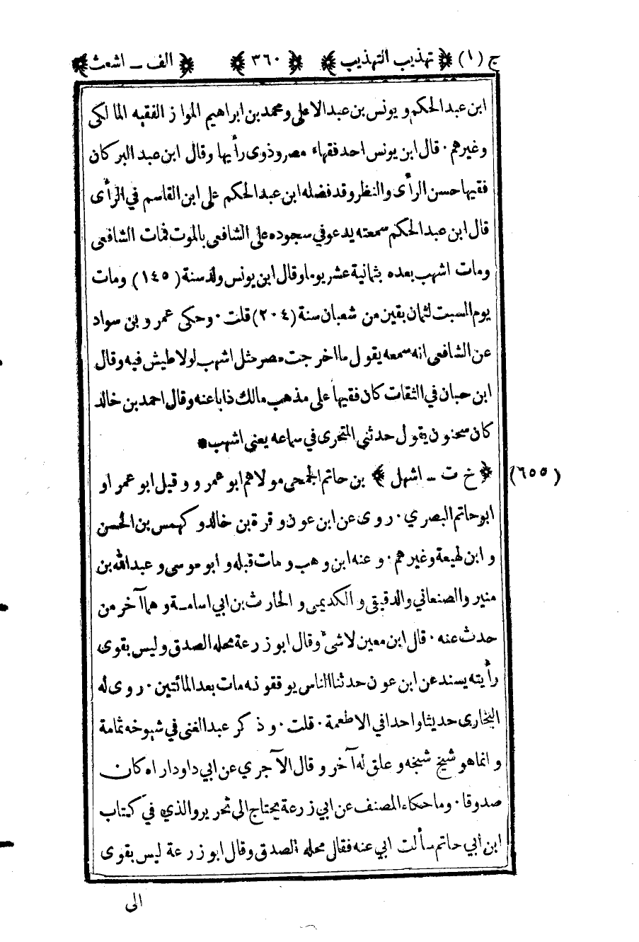 655 ـ "خ ت - أشهل" بن حاتم الجمحي مولاهم أبو عمرو وقيل أبو عمر أو أبو حاتم البصري. روى عن ابن عون وقرة بن خالد وكهمس بن الحسن وابن لهيعة وغيرهم. وعنه ابن وهب ومات قبله وأبو موسى وعبد الله بن منير والصنعاني والدقيقي والكديمي والحارث بن أبي أسامة وهما آخر من حدث عنه. قال ابن معين: "لا شيء" وقال أبو زرعة: "محله الصدق وليس بقوي" رأيته يسند عن ابن عون حدثنا الناس يوثقونه مات بعد المائتين روى له البخاري حديثا واحدا في الأطعمة. قلت: وذكره عبد الغني في شيوخه ثمامة وإنما هو شيخ شيخه وعلق له آخر وقال الآجري عن أبي داود: "كان صدوقا": وما حكاه المصنف عن أبي زرعة يحتاج إلى تحرير والذي في كتاب ابن أبي حاتم سألت أبي عنه فقال: "محله الصدق" وقال أبو زرعة: ليس بقوي"