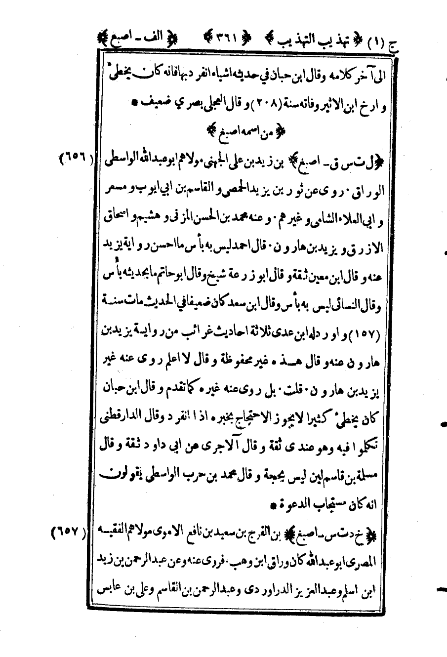 656 ـ "ل ت س ق - أصبغ" بن زيد بن علي الجهني مولاهم أبو عبد الله الواسطي الوراق. روى عن ثور بن يزيد الحمصي والقاسم بن أبي أيوب ومسعر وأبي العلاء الشامي وغيرهم. وعنه محمد بن الحسن المزني وهشيم وإسحاق الأزرق ويزيد بن هارون قال أحمد: "ليس به بأس ما أحسن رواية يزيد عنه" وقال ابن معين: "ثقة" وقال أبو زرعة: "شيخ" وقال أبو حاتم: "ما بحديثه بأس" وقال النسائي: "ليس به بأس" وقال ابن سعد: "كان ضعيفا في الحديث" مات سنة "157" وأورد له ابن عدي ثلاثة أحاديث غرائب من رواية يزيد بن هارون عنه وقال هذه غير محفوظة وقال لا أعلم روى عنه غير يزيد بن هارون. قلت: بل روى عنه غيره كما تقدم وقال ابن حبان: "كان يخطىء كثيرا لا يجوز الاحتجاج بخبره إذا انفرد" وقال الدارقطني: "تكلموا فيه وهو عندي ثقة" وقال الآجري عن أبي داود: "ثقة" وقال مسلمة بن قاسم: "لين ليس بحجة" وقال محمد بن حرب الواسطي يقولون أنه: "كان مستجاب الدعوة".