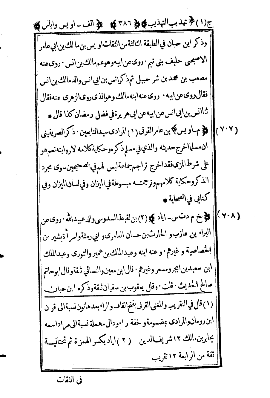 707 ـ "م - أويس" بن عامر القرني1 المرادي سيد التابعين. ذكر الصريفيني أن مسلما أخرج حديثه والذي في مسلم ذكره وحكاية كلامه لا روايته نعم هو على شرط المزي فقد أخرج تراجم جماعة ليس لهم في الصحيحين سوى مجرد الذكر وحكاية كلامهم وترجمته مبسوطة في الميزان وفي لسان الميزان وفي كتابي في الصحابة.