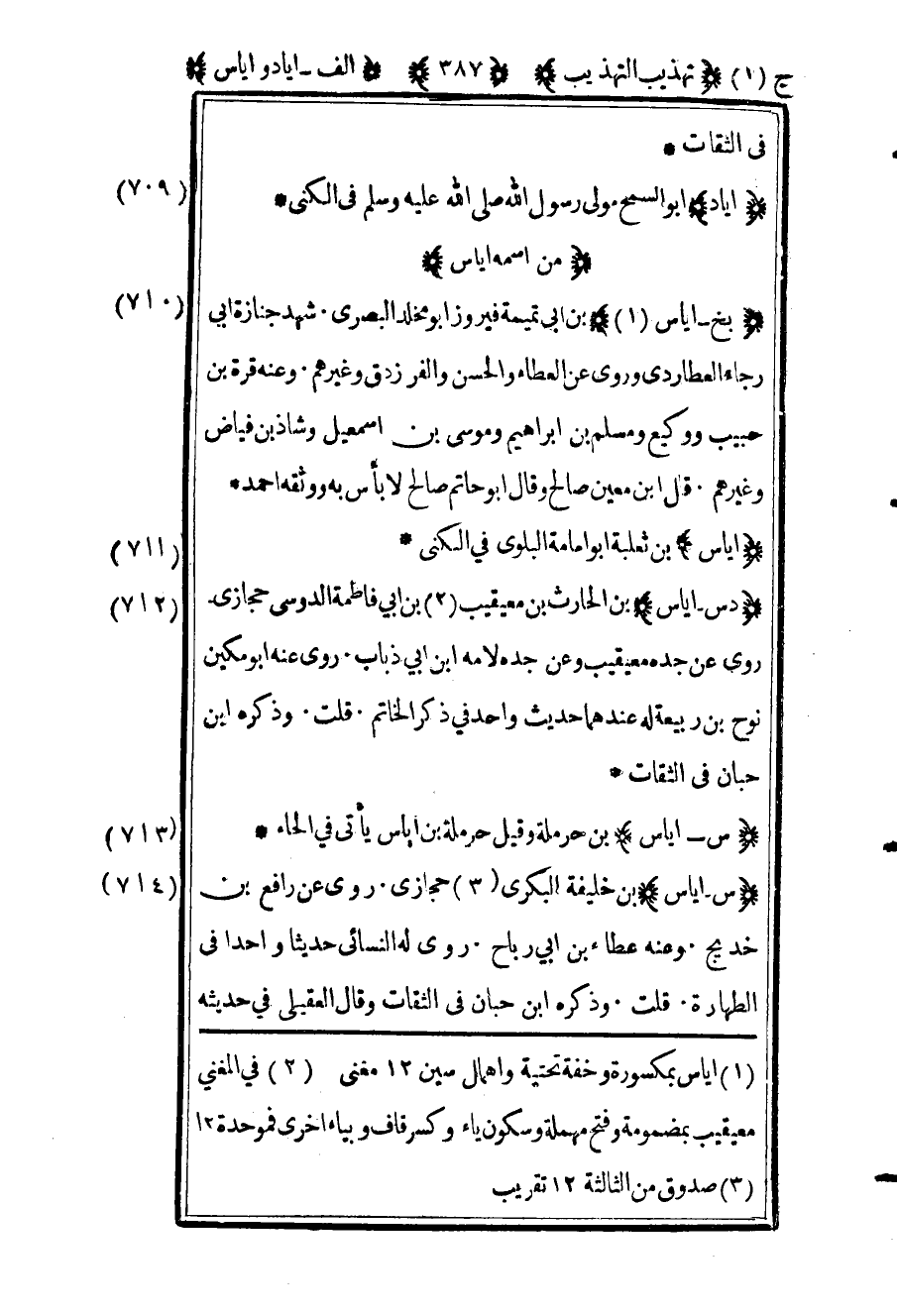 710 ـ "بخ - إياس1" بن أبي تميمة فيروز أبو مخلد البصري. شهد جنازة أبي رجاء العطاردي وروى عن العطاء والحسن والفرزدق وغيرهم. وعنه قرة بن حبيب ووكيع ومسلم بن إبراهيم وموسى بن إسماعيل وشاذ بن فياض وغيرهم. قال ابن معين: "صالح" وقال أبو حاتم: "صالح لا بأس به" ووثقه أحمد.
