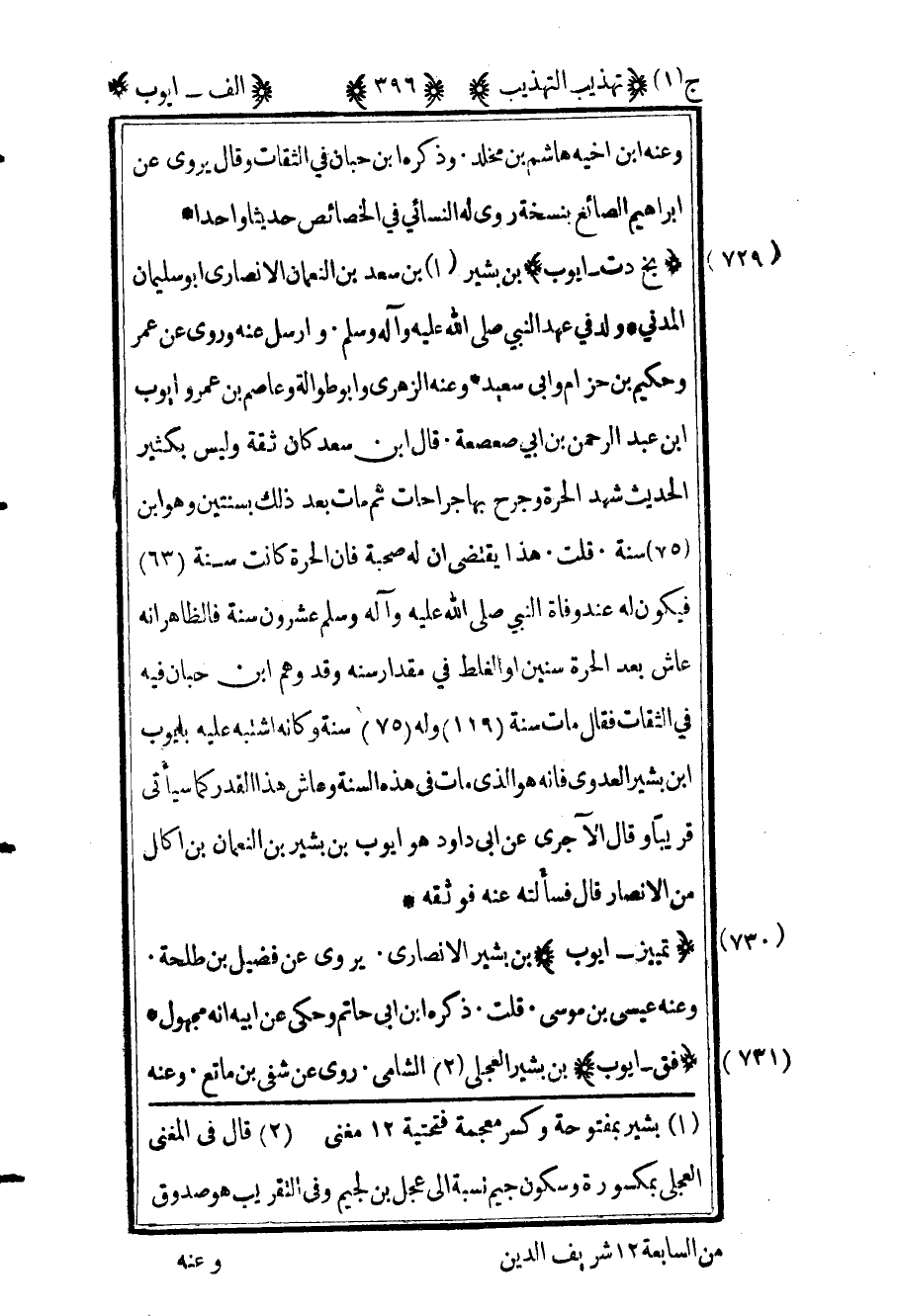 729 ـ "بخ د ت - أيوب" بن بشير1 بن سعد بن النعمان الأنصاري أبو سليمان المدني. ولد في عهد النبي صلى الله عليه وآله وسلم وأرسل عنه وروى عن عمر وحكيم بن حزام وأبي سعيد. وعنه الزهري وأبو طوالة وعاصم بن عمر وأيوب بن عبد الرحمن بن أبي صعصعة. قال ابن سعد: كان ثقة وليس بكثير الحديث شهد الحرة وجرح بها جراحات ثم مات بعد ذلك بسنتين وهو ابن "75" سنة. قلت هذا يقتضى أن له صحبة فإن الحرة كانت سنة "63" فيكون له عند وفاة النبي صلى الله عليه وآله وسلم عشرون سنة فالظاهر أنه عاش بعد الحرة سنين أو الغلط في مقدار سنه وقد وهم ابن حبان فيه في الثقات فقال مات سنة "119" وله "75" سنة وكأنه اشتبه عليه بأيوب بن بشير العدوي فإنه هو الذي مات في هذه السنة وعاش هذا القدر كما سيأتي قريبا وقال الآجري عن أبي داود هو أيوب بن بشير بن النعمان بن أكال من الأنصار قال فسألته عنه فوثقه.