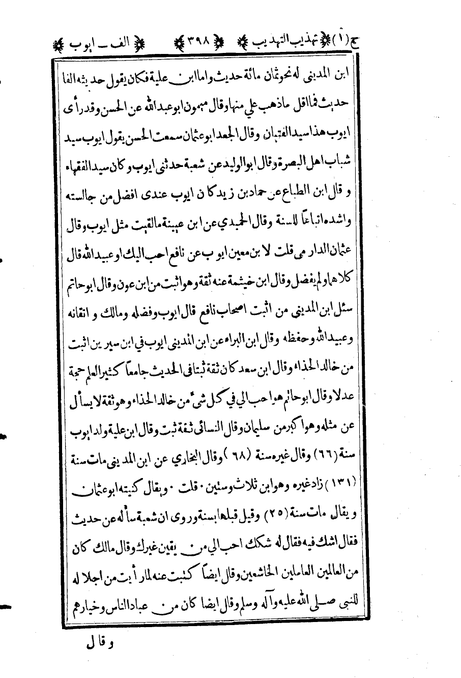 ابن المديني له نحو ثمان مائة حديث وأما ابن علية فكان يقول حديثه ألفا حديث فما أقل ما ذهب علي منها وقال ميمون أبو عبد الله عن الحسن وقد رأى أيوب هذا سيد الفتيان وقال الجعد أبو عثمان سمعت الحسن يقول: "أيوب سيد شباب أهل البصرة" وقال أبو الوليد عن شعبة حدثني أيوب وكان سيد الفقهاء وقال ابن الطباع عن حماد بن زيد كان أيوب عندي أفضل من جالسته وأشده اتباعا للسنة وقال الحميدي عن ابن عيينة ما لقيت مثل أيوب وقال عثمان الدارمي قلت لابن معين أيوب عن نافع أحب إليك أو عبيد الله قال كلاهما ولم يفضل وقال ابن خيثمة عنه "ثقة" وهو أثبت من بن عون وقال أبو حاتم سئل ابن المديني من أثبت أصحاب نافع قال أيوب وفضله ومالك وإتقانه وعبيد الله وحفظه وقال ابن البراء عن ابن المديني أيوب في ابن سيرين أثبت من خالد الحذاء وقال ابن سعد: "كان ثقة ثبتا في الحديث جامعا كثير العلم حجة عدلا" وقال أبو حاتم: "هو أحب إلي في كل شيء من خالد الحذاء وهو ثقة لا يسأل عن مثله وهو أكبر من سليمان" وقال النسائي: "ثقة ثبت" وقال ابن علية ولد أيوب سنة "66" وقال غيره سنة "68" وقال البخاري عن بن المديني مات سنة "131" زاد غيره وهو ابن ثلاث وستين. قلت: ويقال كنيته أبو عثمان ويقال مات سنة "25" وقيل قبلها بسنة وروى أن شعبة سأله عن حديث فقال أشك فيه فقال له شكك أحب إلي من يقين غيرك وقال مالك: "كان من العالمين العاملين الخاشعين" وقال أيضا: "كتبت عنه لما رأيت من اجلاله للنبي صلى الله عليه وآله وسلم" وقال أيضا: "كان من عباد الناس وخيارهم"