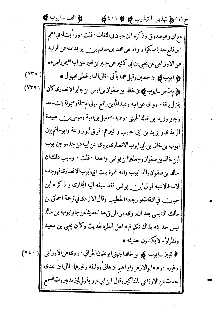 740 ـ "تمييز- أيوب" بن خالد الجهني أبو عثمان الحراني. روى عن الأوزاعي وغيره وعنه أبو الأزهر وإبراهيم بن هانئ ووثقه وغيرهما قال ابن عدي: "حدث عن الأوزاعي بالمناكير" وقال ابن أبي عروبة ولي ليزيد بيروت فسمع