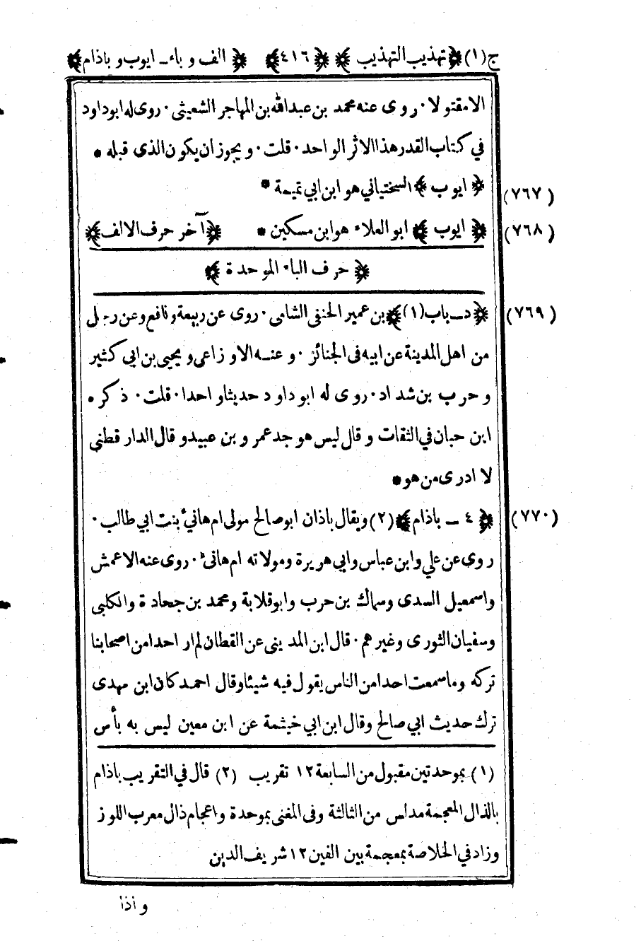 770 ـ "4 – باذام2" ويقال باذان أبو صالح مولى أم هانئ بنت أبي طالب. روى عن علي وابن عباس وأبي هريرة ومولاته أم هانئ. روى عنه الأعمش وإسماعيل السدي وسماك بن حرب وأبو قلابة ومحمد بن جحادة والكلبي وسفيان الثوري وغيرهم. قال ابن المديني عن القطان: "لم أر أحدا من أصحابنا تركه وما سمعت أحدا من الناس يقول فيه شيئا" وقال أحمد: "كان ابن مهدي ترك حديث أبي صالح" وقال ابن أبي خيثمة عن ابن معين: "ليس به بأس