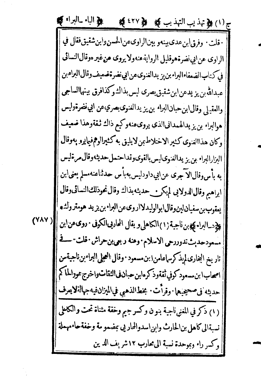 787 ـ "د - البراء" بن ناجية1 الكاهلي ويقال المحاربي الكوفي. روى عن ابن مسعود "حديث تدور رحى الإسلام" وعنه ربعي بن حراش. قلت: في تاريخ البخاري لم يذكر سماعا من ابن مسعود وقال العجلي البراء ابن ناجية من أصحاب ابن مسعود "كوفي ثقة" وذكره ابن حبان في الثقات وأخرج هو والحاكم حديثه في صحيحيهما وقرأت بخط الذهبي في الميزان: "فيه جهالة لا يعرف"